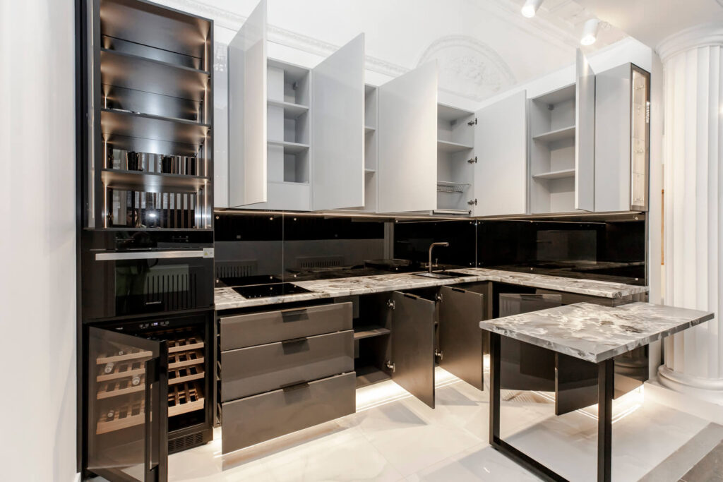 - Закалённое стекло на фасадах с внутренним хранением — если ребёнок ударит, не порежется.