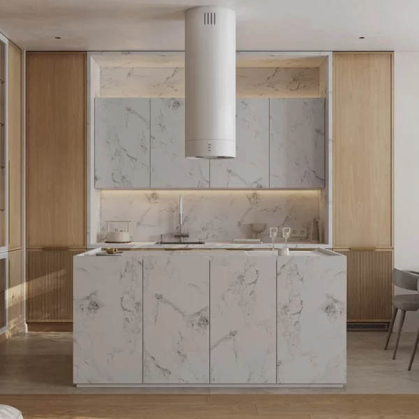 ФАСАДЫ Т431В / Т441 Шпон дуба, цвет #183 (масловоск Бесцветный) / пластик HPL Möbius Soft Touch, декор Мрамор Бернини СТОЛЕШНИЦА Пластик HPL, 38 мм, декор Мрамор Бернини ВИТРИНЫ: Алюминиевый профиль...