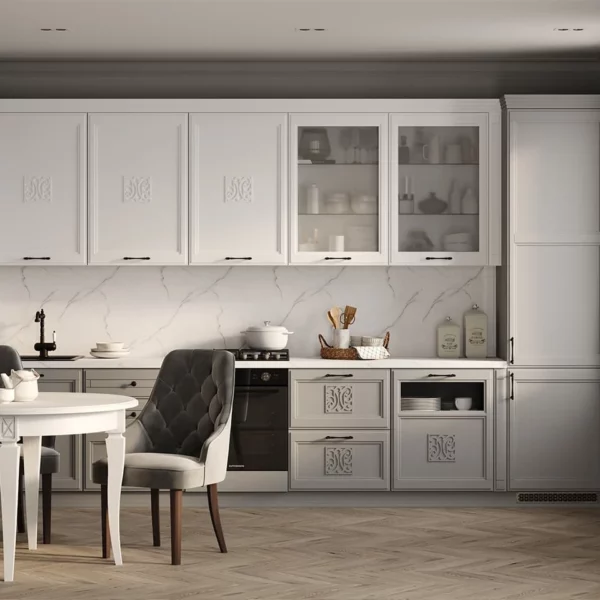 Кухня «Веритате» выполнена с фасадами из пластика и дубового массива, добавляя сочетание современности и натурального стиля. Сбоку пенала расположен стильный сервант с полками из стекла...
