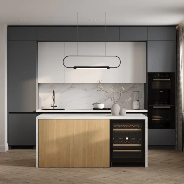 Кухня «Аврора‘24» выполнена с фасадами из крашеного МДФ в оттенках NCS S 5005-G50Y и S 1500-N матовый, а также дополнена ЛДСП «Тимбер» с декором «Рока»,...