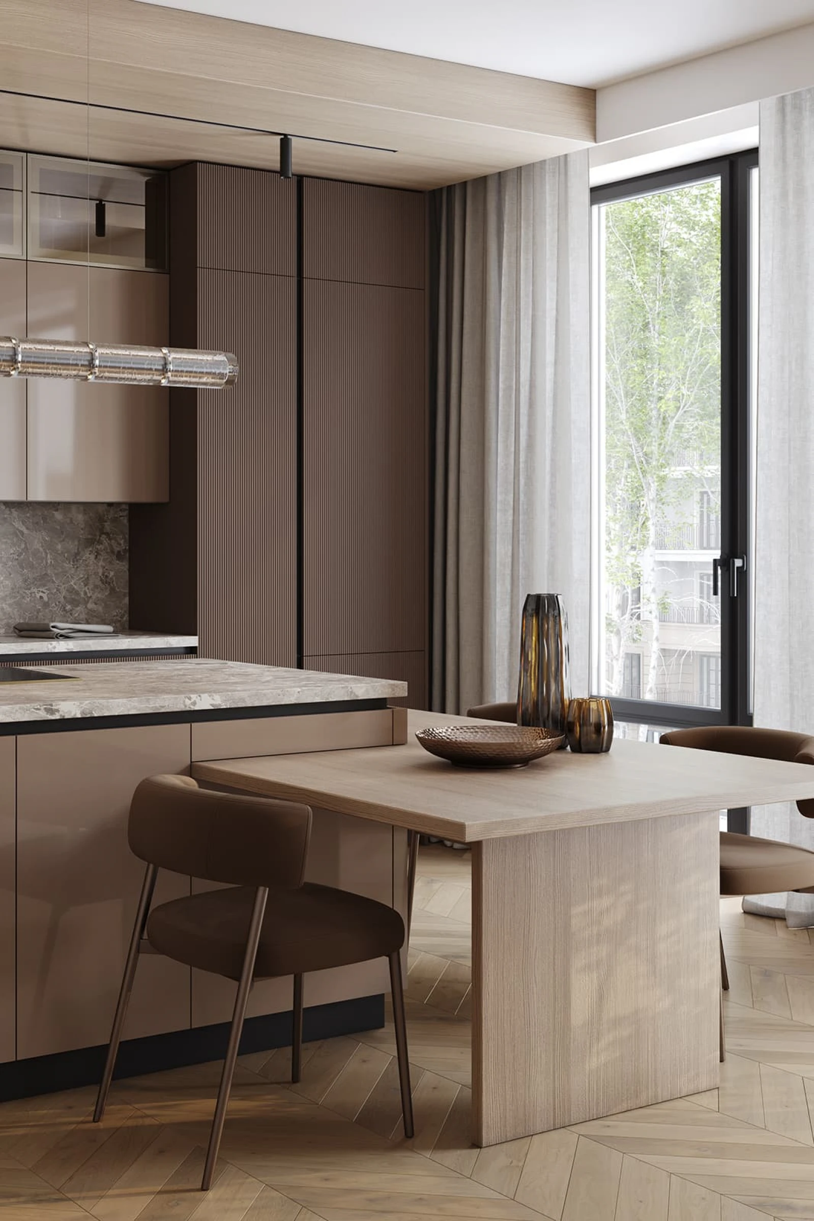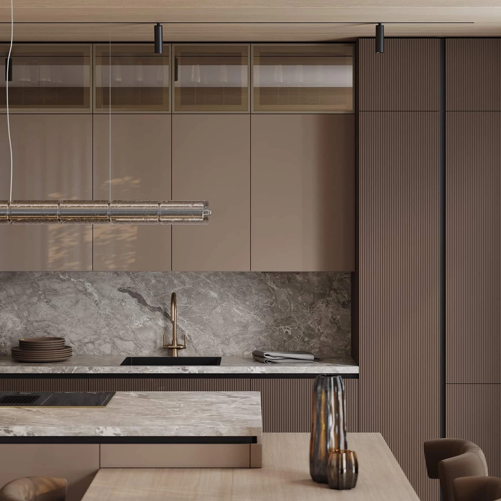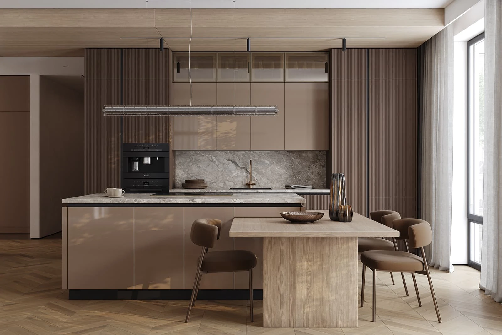 Современная кухня «АЛЬМОНД» сочетает выразительные контрасты и продуманную эргономику. Фасады из крашеной МДФ объединяют матовый темно-коричневый и глянцевый бежевый оттенки. Столешницы включают пластик HPL декора Римский Камень и массив дуба с белым воскобейцем. Витрины с алюминиевым профилем цвета Шампань и бронзовым стеклом добавляют изысканности.