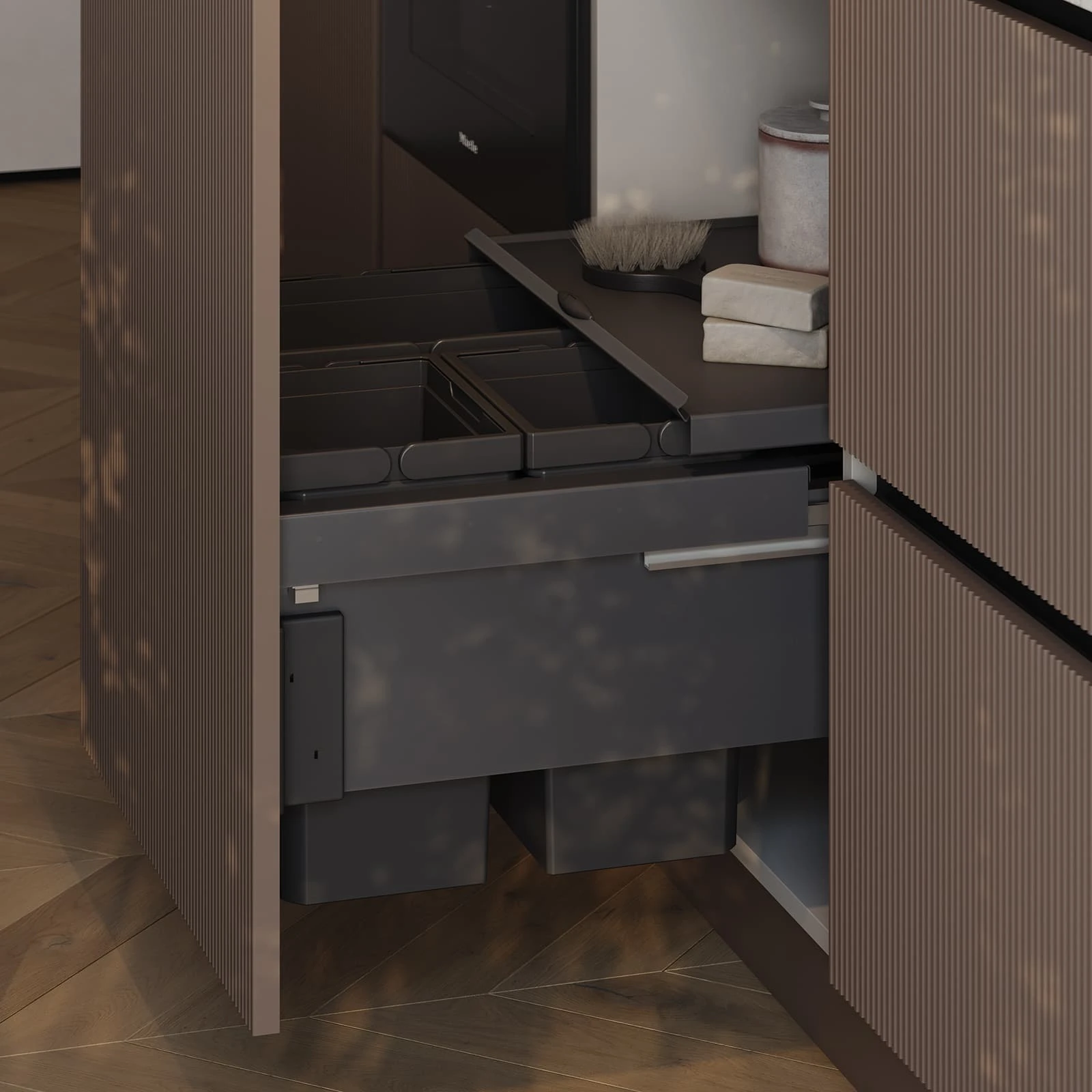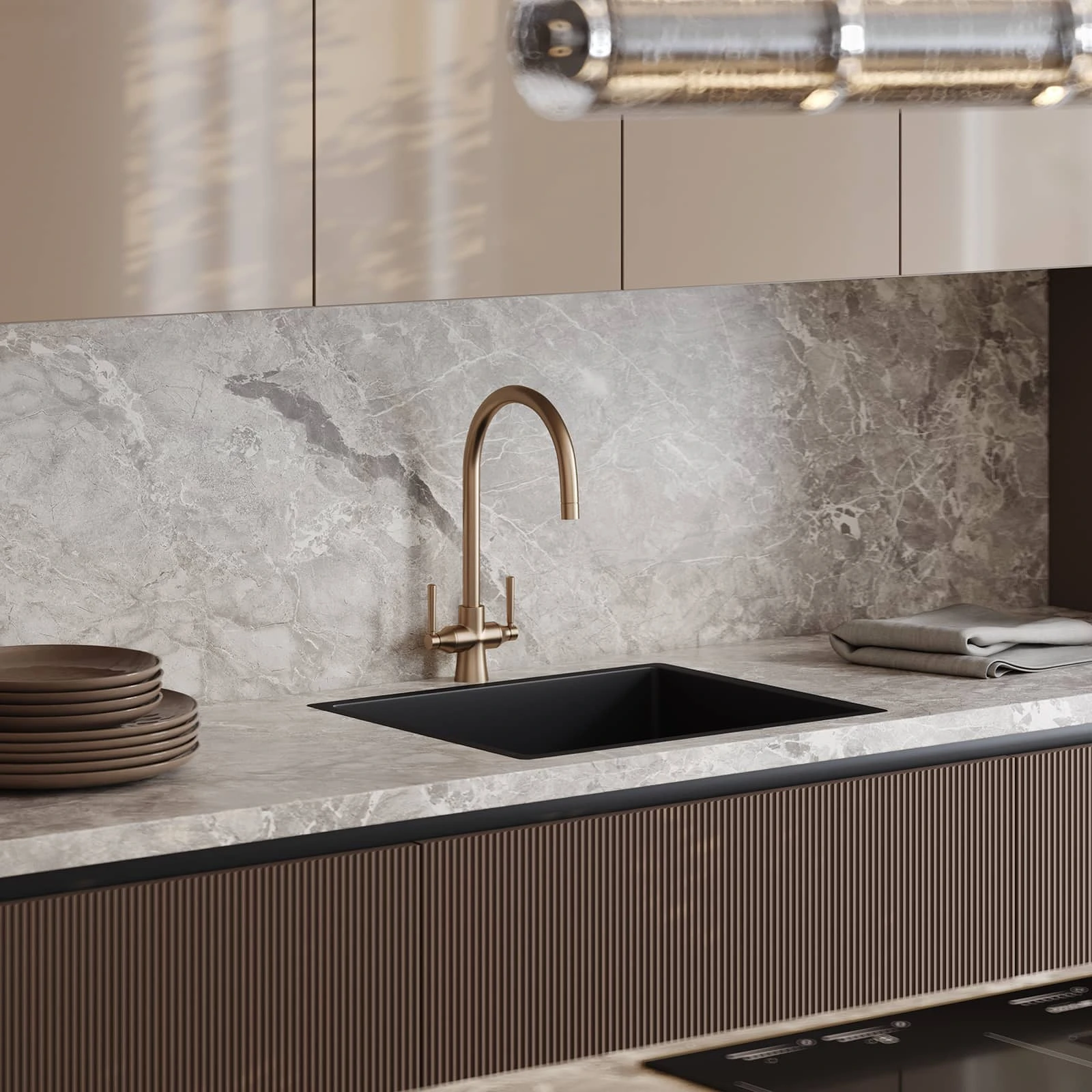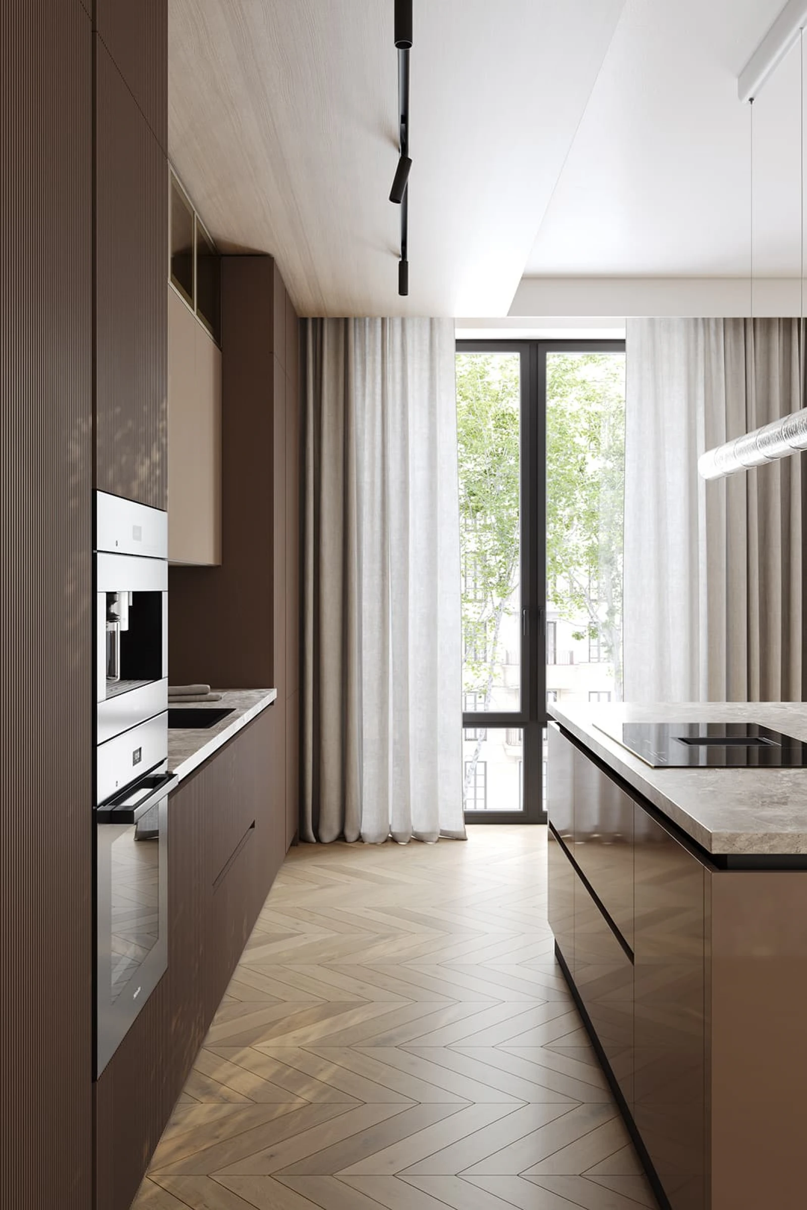 Современная кухня «АЛЬМОНД» сочетает выразительные контрасты и продуманную эргономику. Фасады из крашеной МДФ объединяют матовый темно-коричневый и глянцевый бежевый оттенки. Столешницы включают пластик HPL декора Римский Камень и массив дуба с белым воскобейцем. Витрины с алюминиевым профилем цвета Шампань и бронзовым стеклом добавляют изысканности.