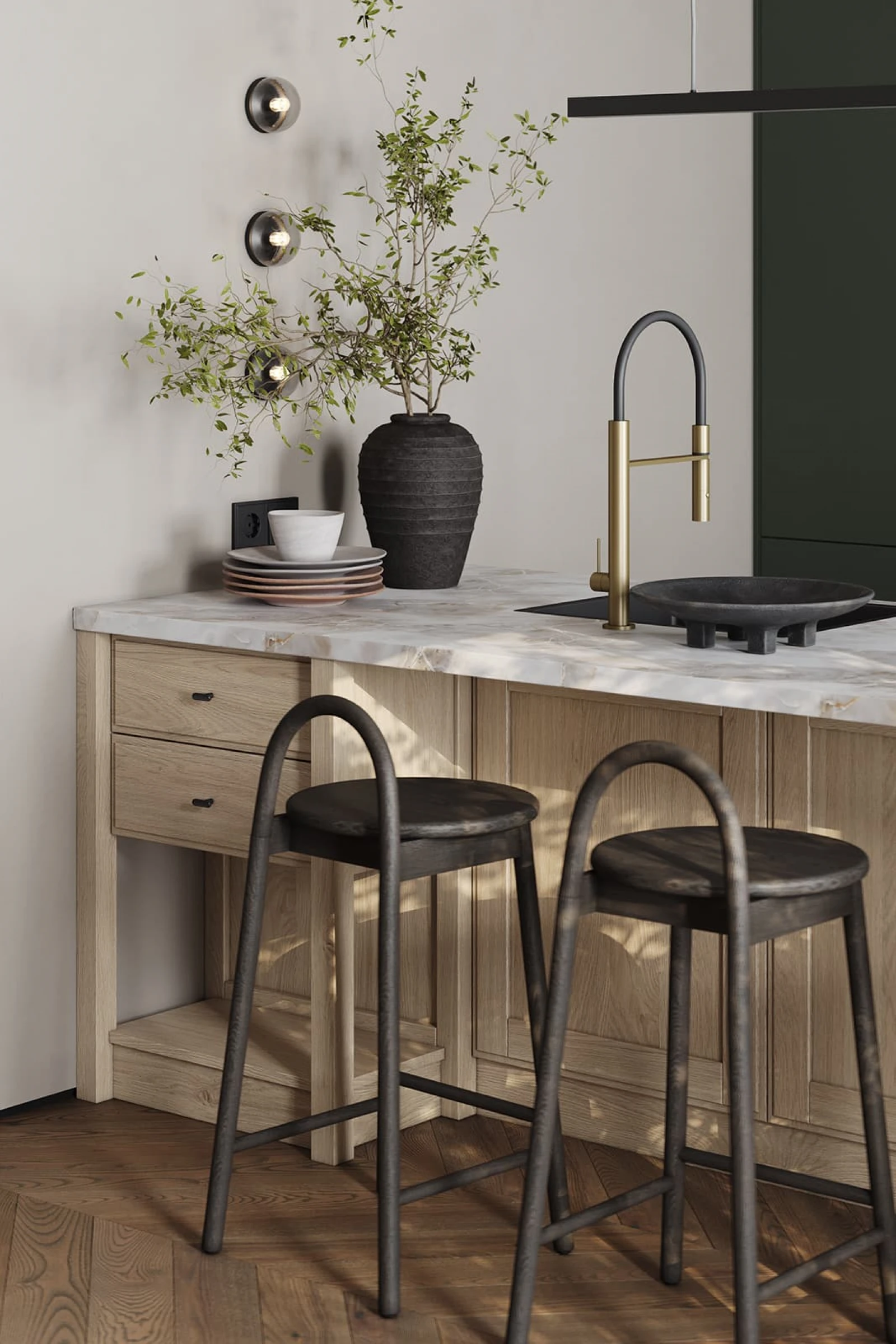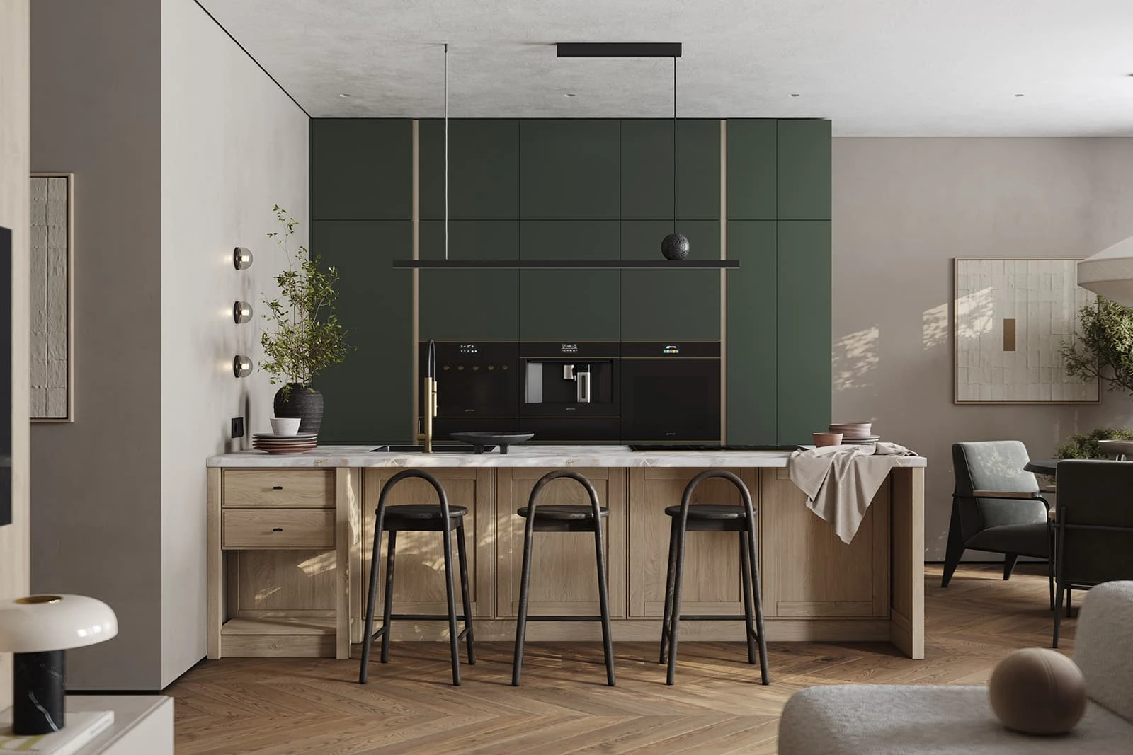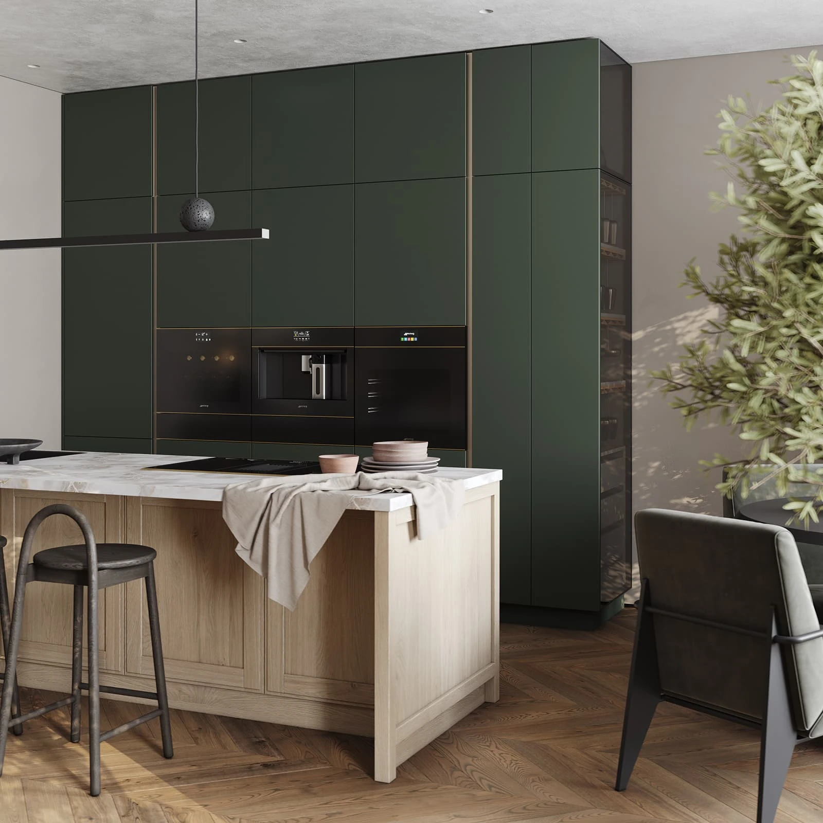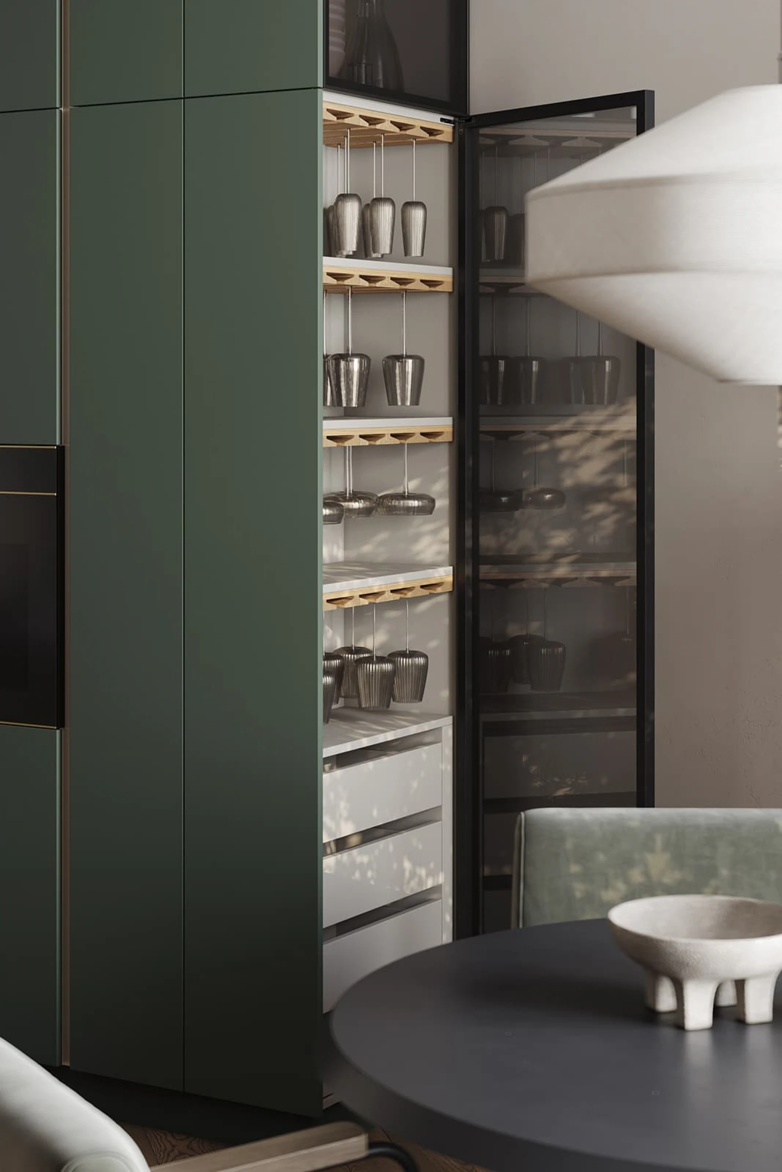Современная кухня «БЕРНАДИН» сочетает природную текстуру дерева и насыщенные оттенки. Фасады объединяют натуральный дуб с белым воскобейцем и ЛМДФ EVOSOFT в цвете Сумрачный Нефрит. Столешница из пластика HPL декора Мерида создает практичную рабочую поверхность. Витрины с черным матовым алюминиевым профилем и графитовым стеклом добавляют контрастности.