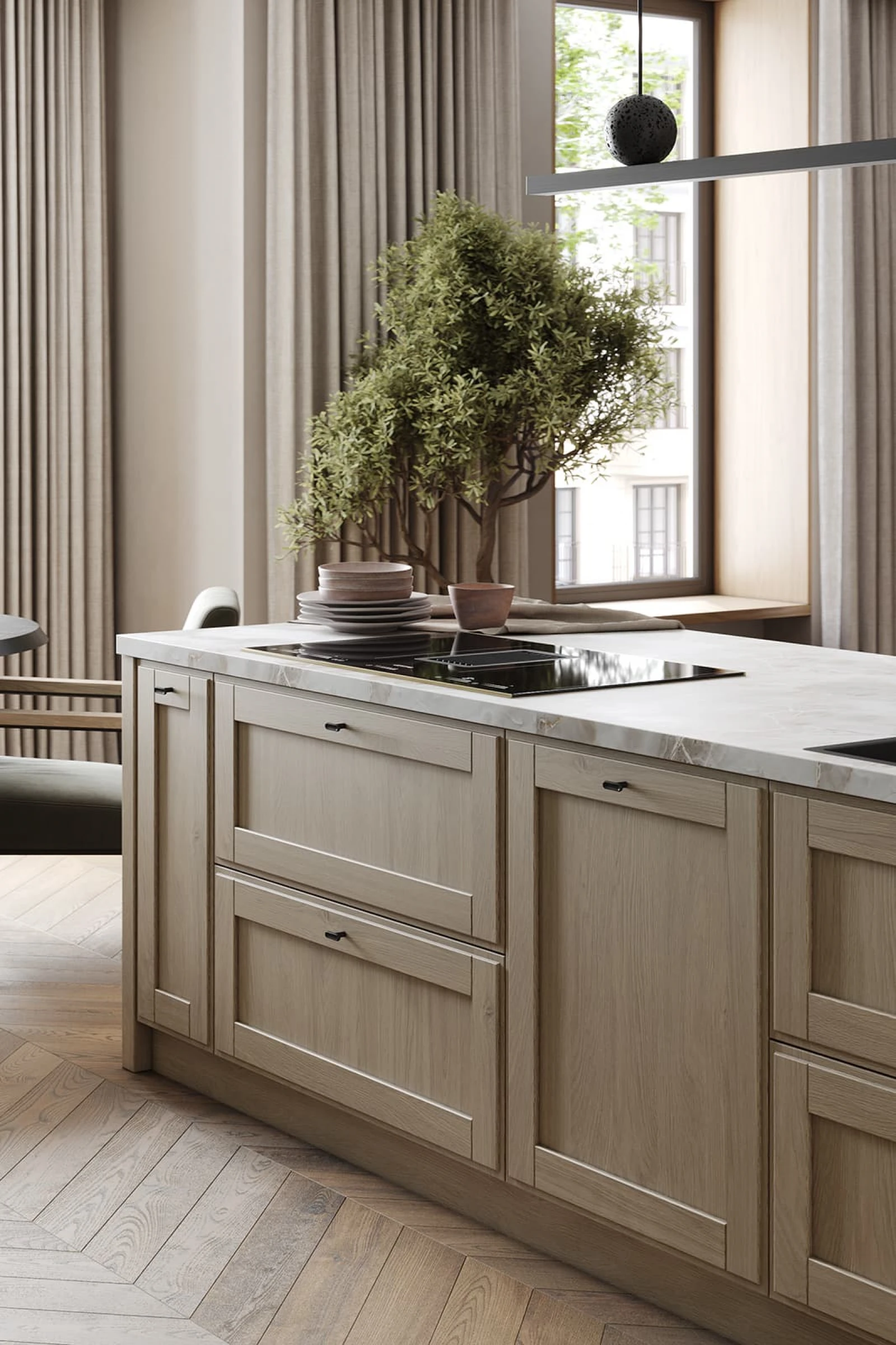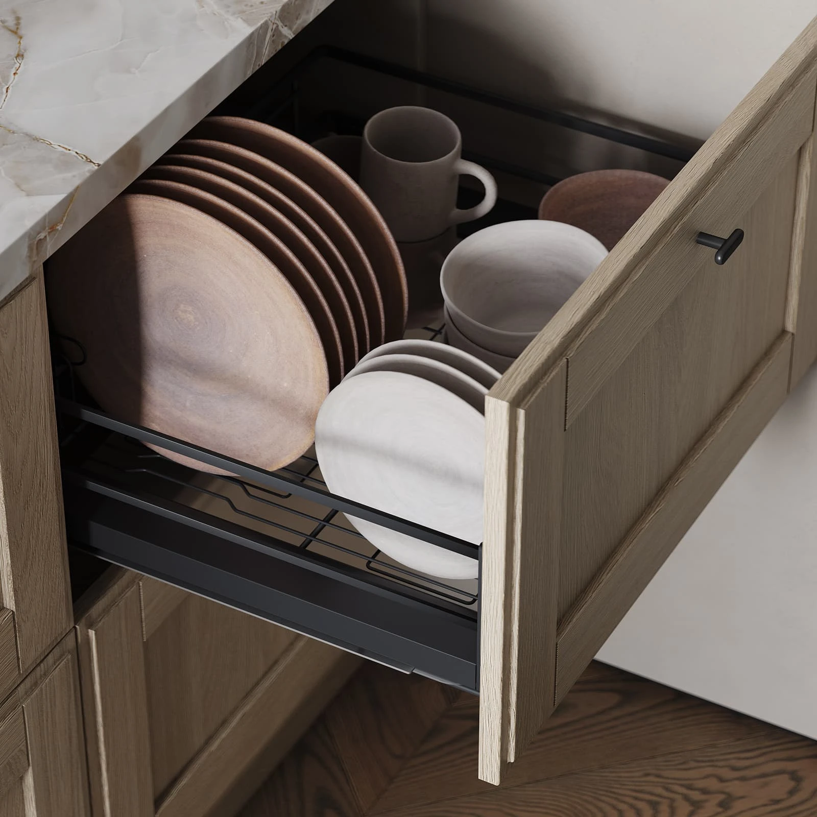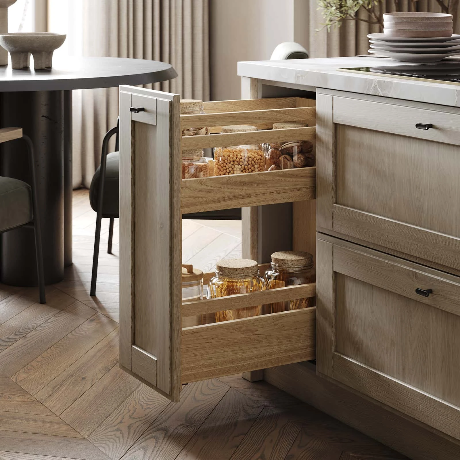 Фабрика ЗОВ изготавливает каждую кухню под заказ по индивидуальному проекту. Мы комплектуем гарнитур механизмами Push to open со скрытыми петлями AIR PUSH, профилями VOLPATO Gola цвета Шампань и практичными аксессуарами из массива дуба: сушкой для посуды Mira, выдвижной системой МОК и держателями для бокалов. Наши специалисты бесплатно создадут дизайн вашей будущей кухни. Сейчас действуют выгодные акции и большие скидки.