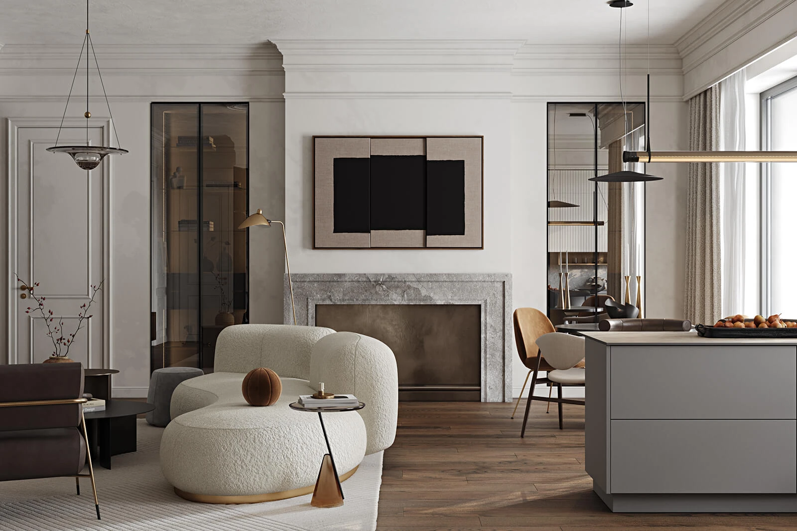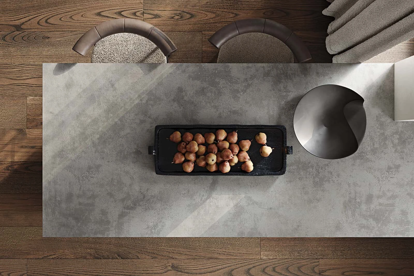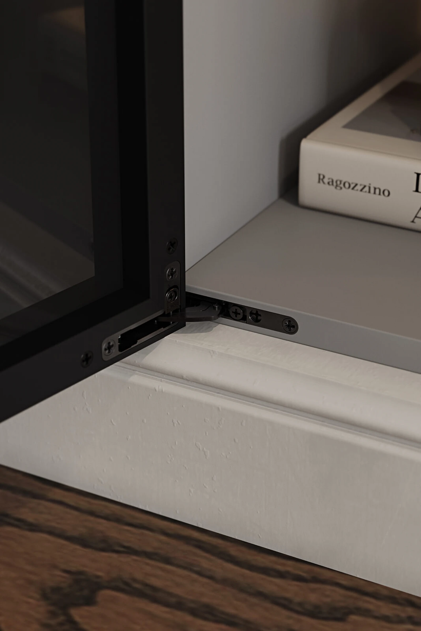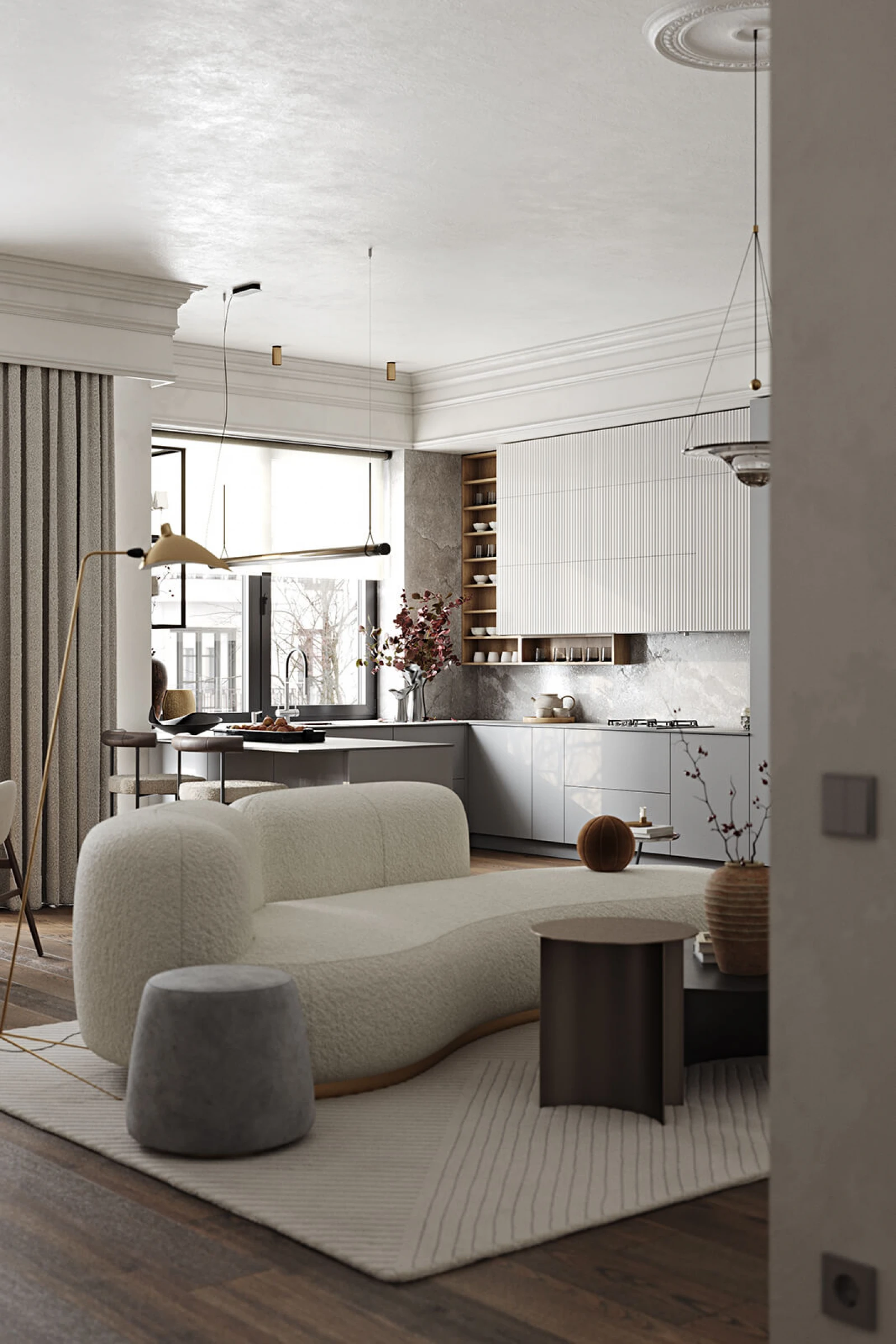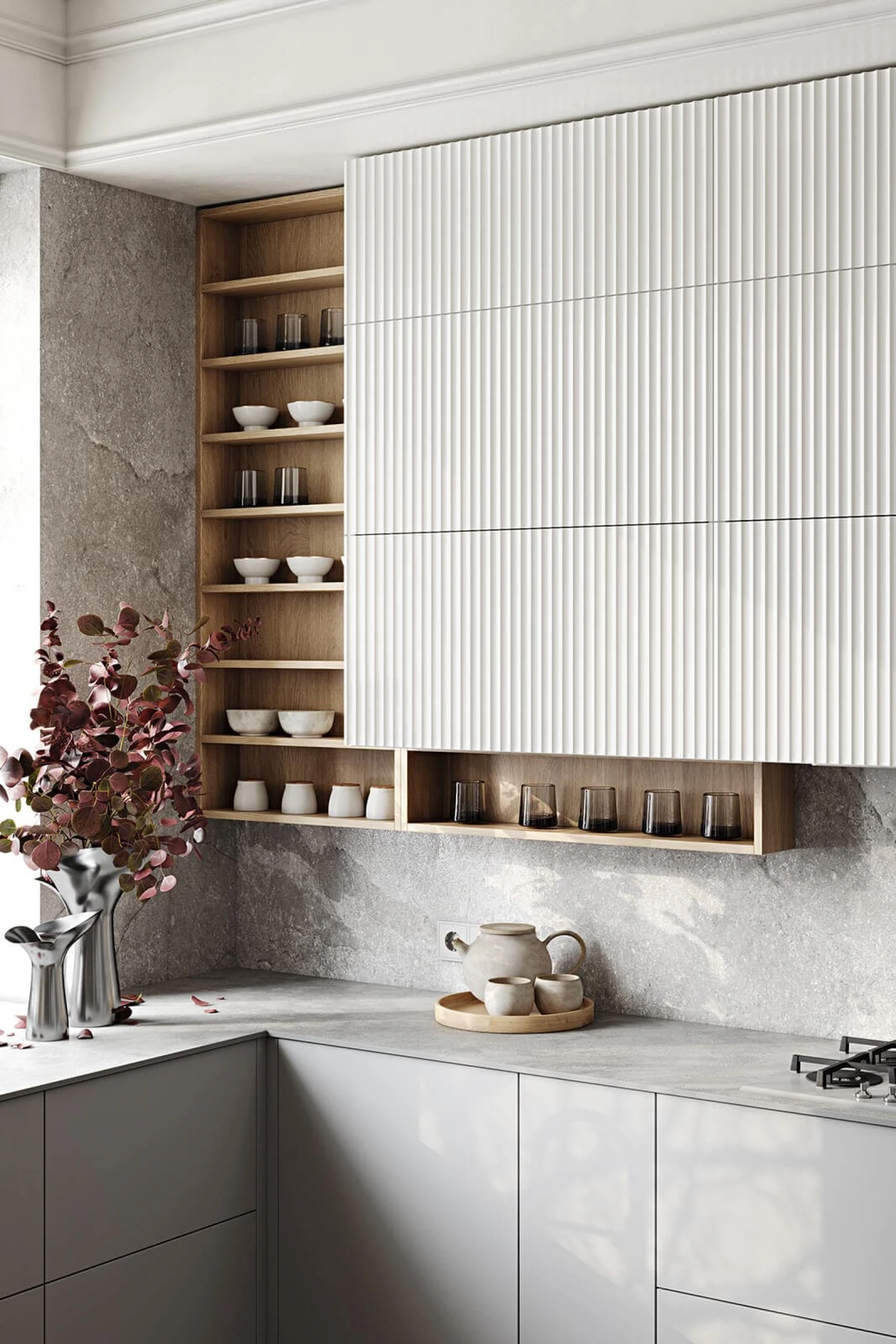 Кухня «ФРАНКА» объединяет элегантность и функциональность в современном исполнении. Фасады Флавио сочетают крашеную МДФ в белом матовом цвете с акрилом FENIX NTM серого оттенка. Компакт-плита декора Цинк Нирвана создает стильную рабочую поверхность. Витрины с черным алюминиевым профилем и бронзовым стеклом добавляют изысканности.