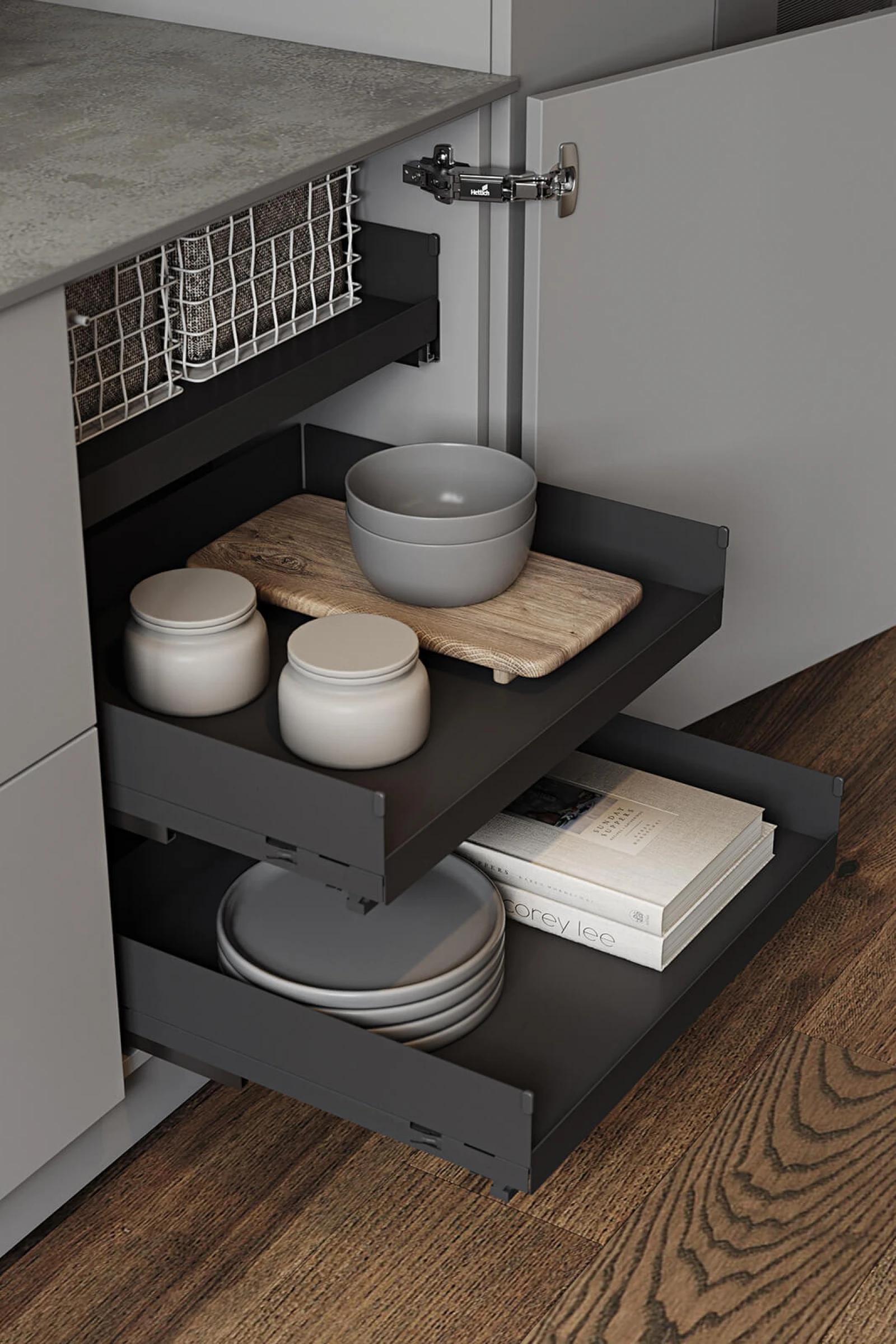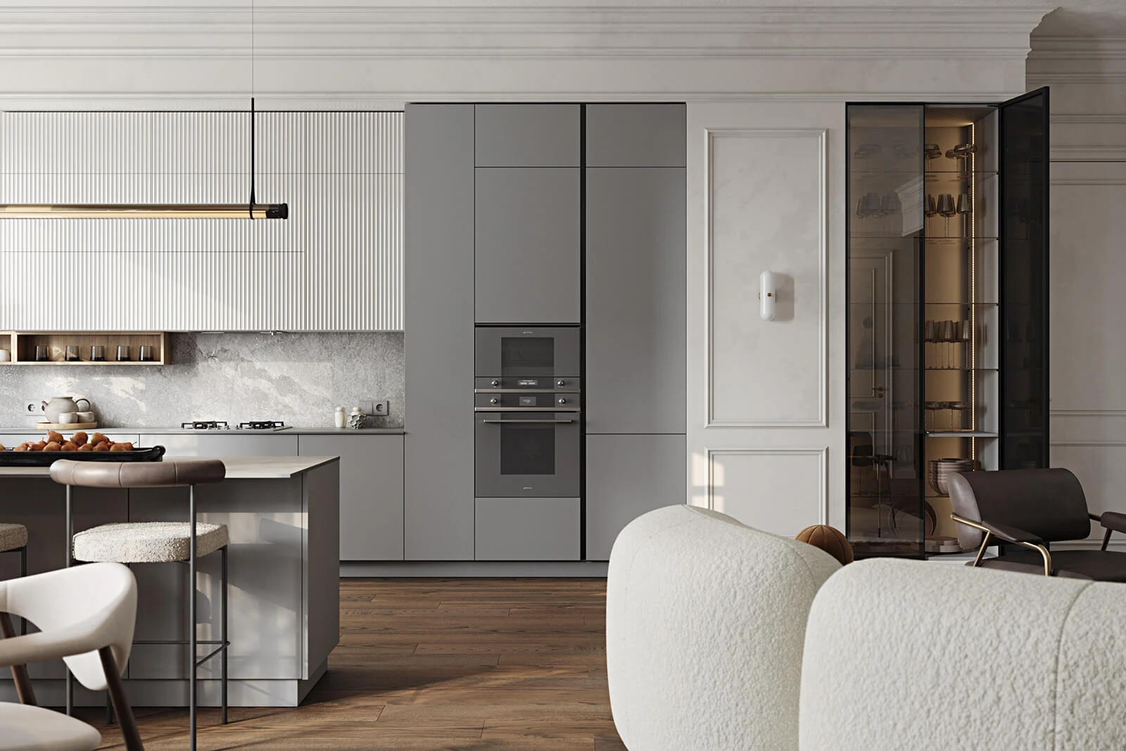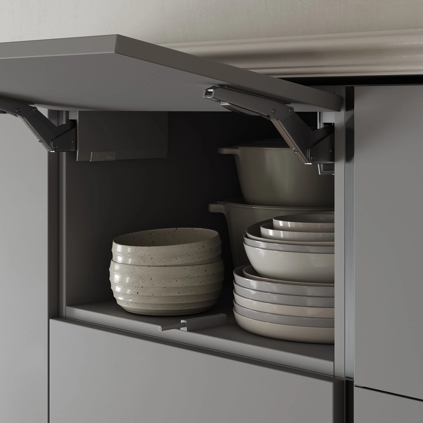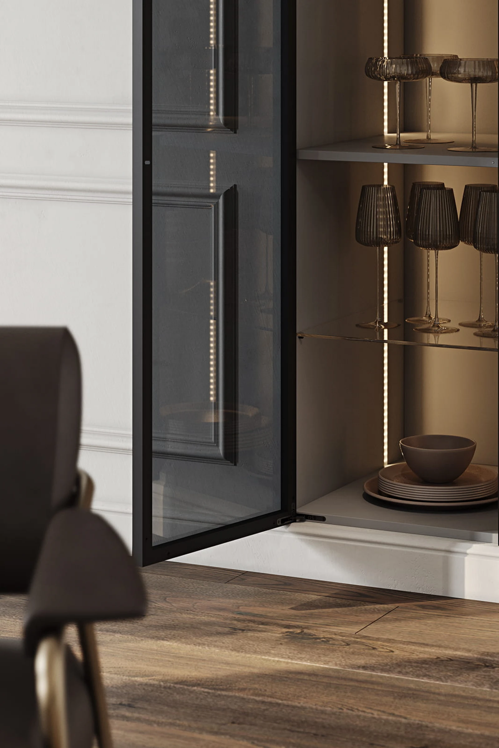 Мы оснащаем кухню механизмами Push to open и скрытыми черными ручками-профилями. Подъемные системы AVENTOS HK top и выдвижные LEGRABOX обеспечивают комфортное использование. Фабрика ЗОВ изготавливает каждую кухню под заказ по индивидуальному проекту. Наши специалисты бесплатно создадут дизайн вашей будущей кухни. Сейчас действуют выгодные акции и большие скидки.
