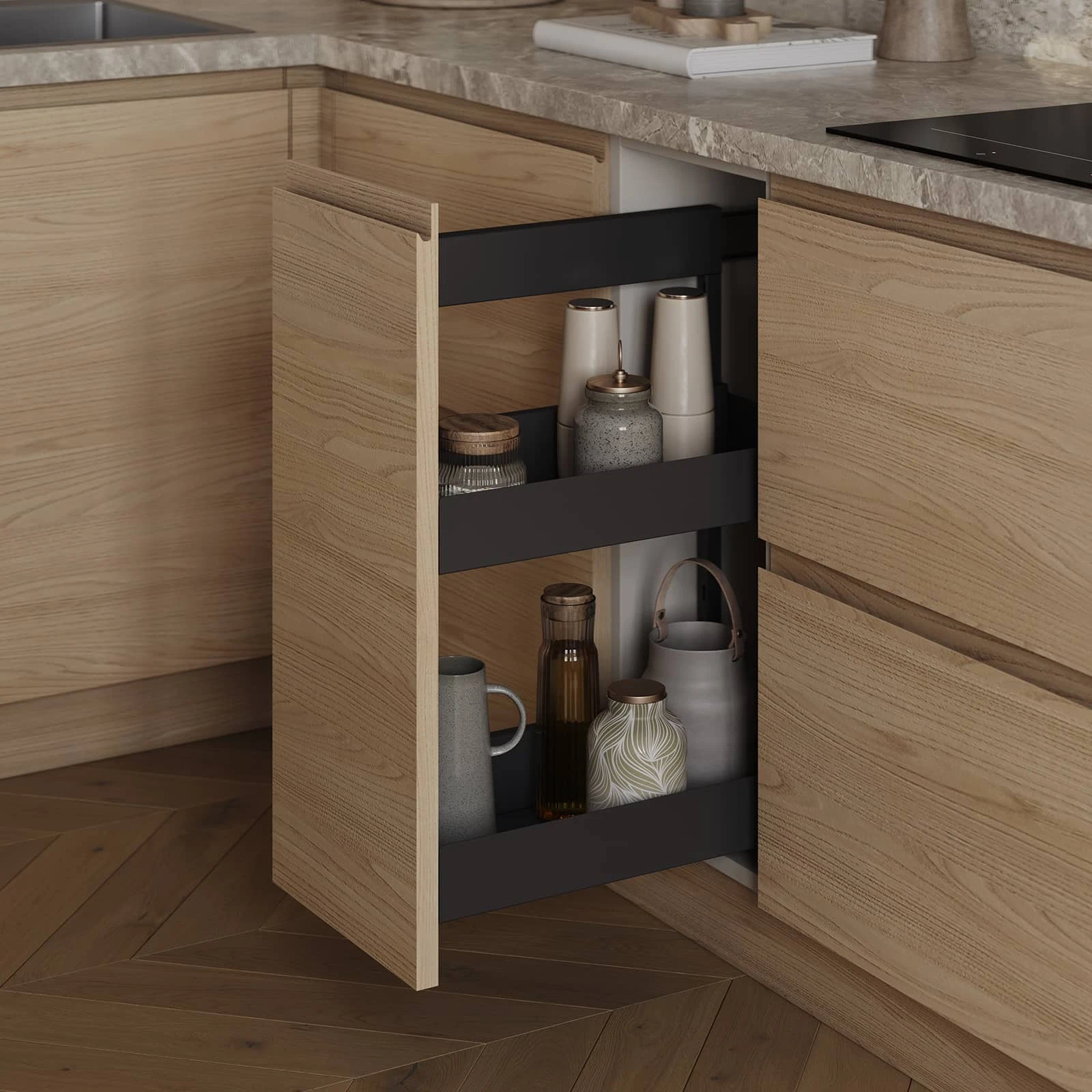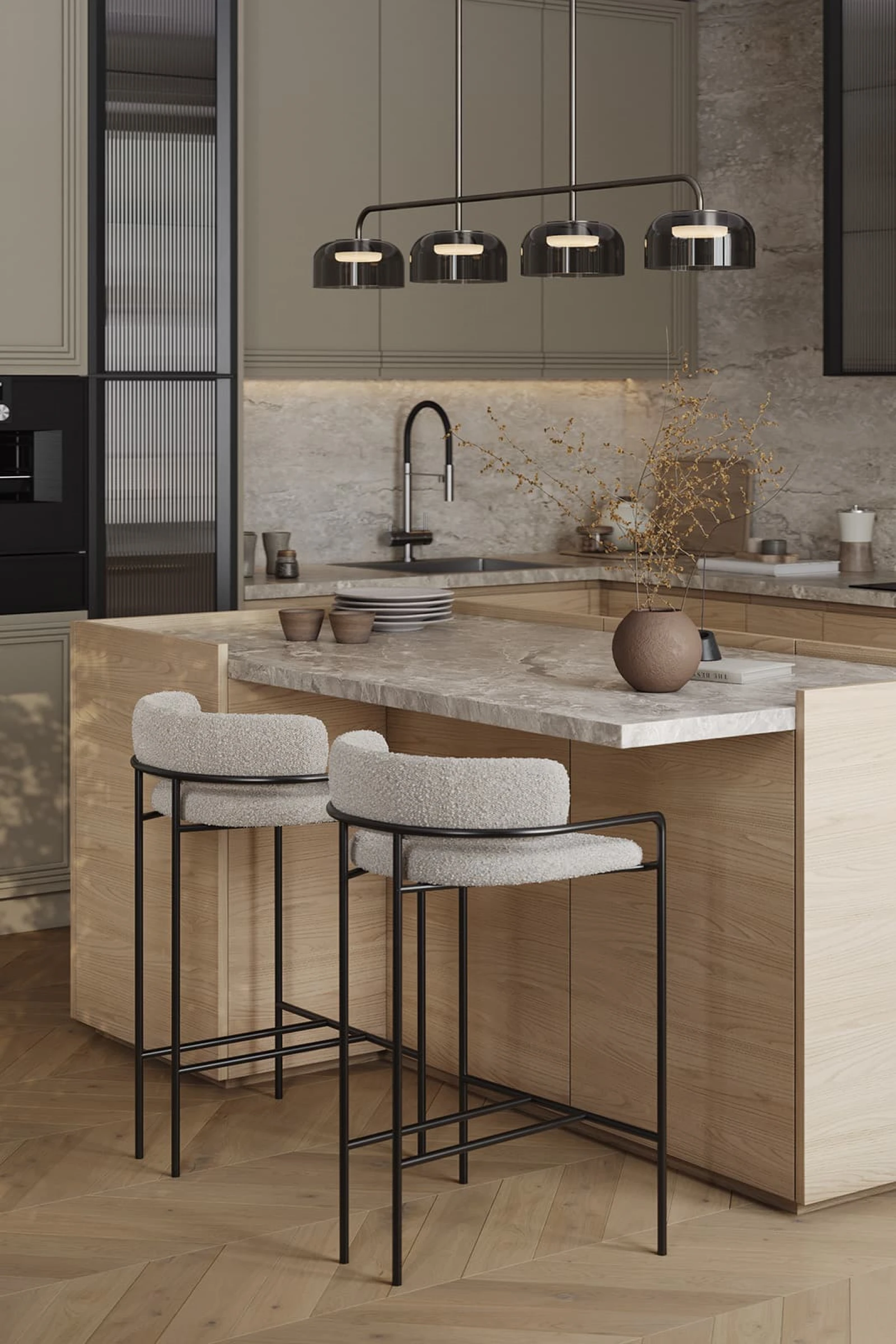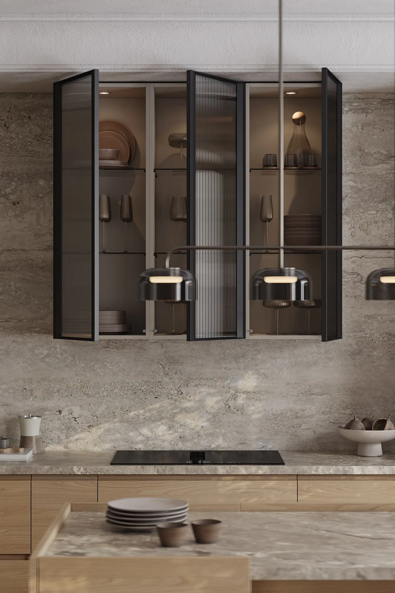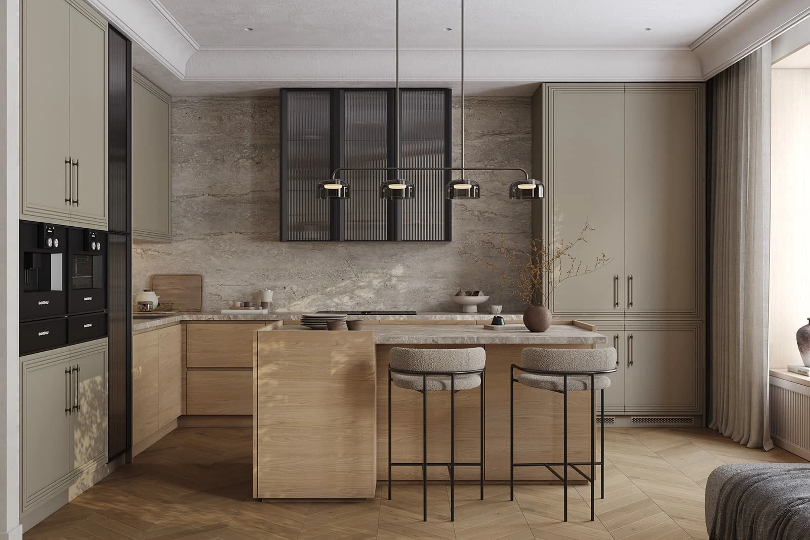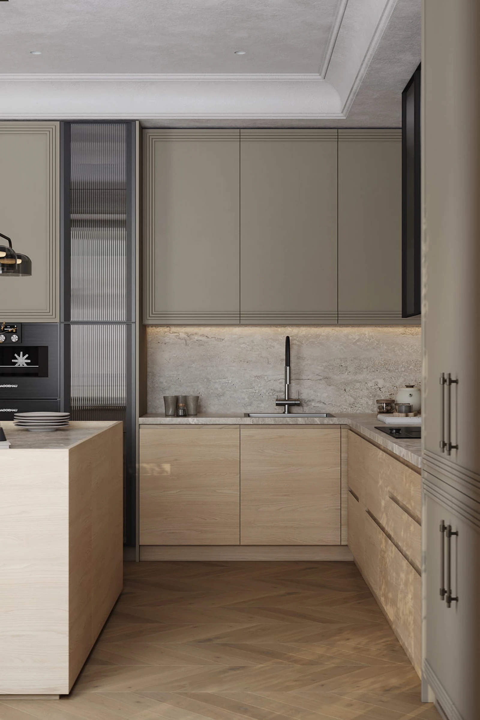 Кухня «ЛАУРА» с комбинированными фасадами воплощает гармонию натуральных материалов и современного дизайна. Фасады объединяют шпон дуба цвета #183 с бесцветным масловоском и крашеную МДФ в благородном оттенке NCS S 4005-G80Y матовый. Столешница из пластика HPL толщиной 38 мм декора Римский Камень создает практичную и износостойкую рабочую поверхность. Витрины с алюминиевым профилем А-4 Черный Матовый и тисненым графитовым стеклом добавляют изысканности интерьеру.