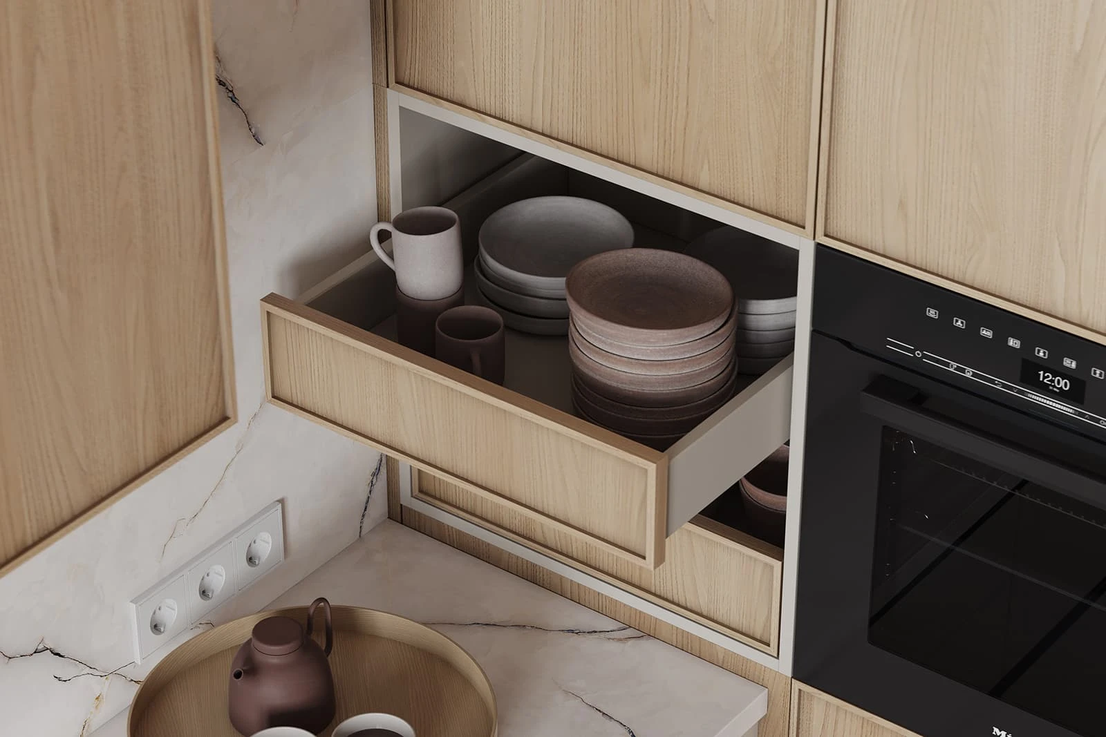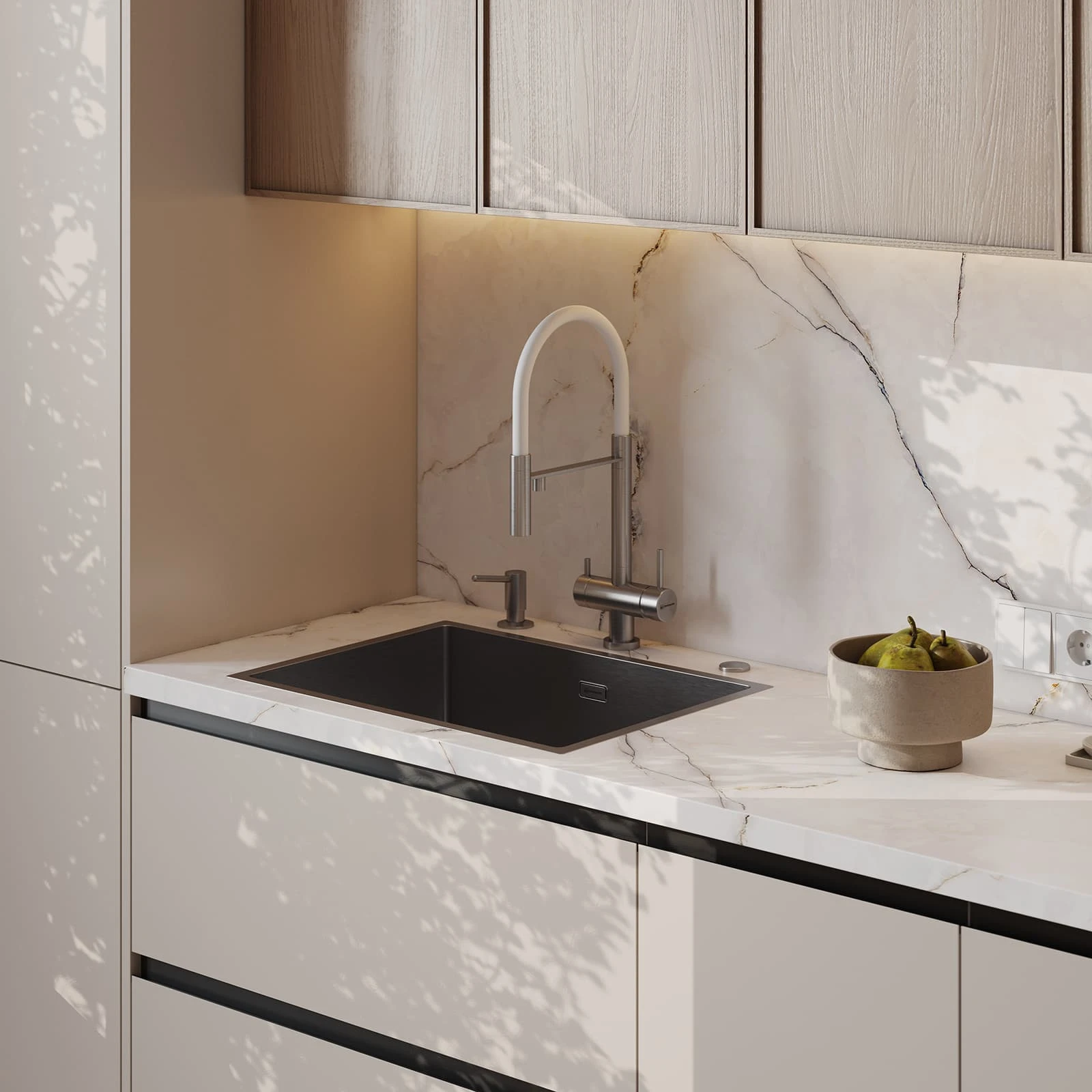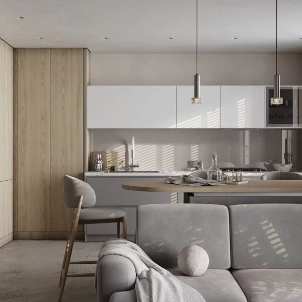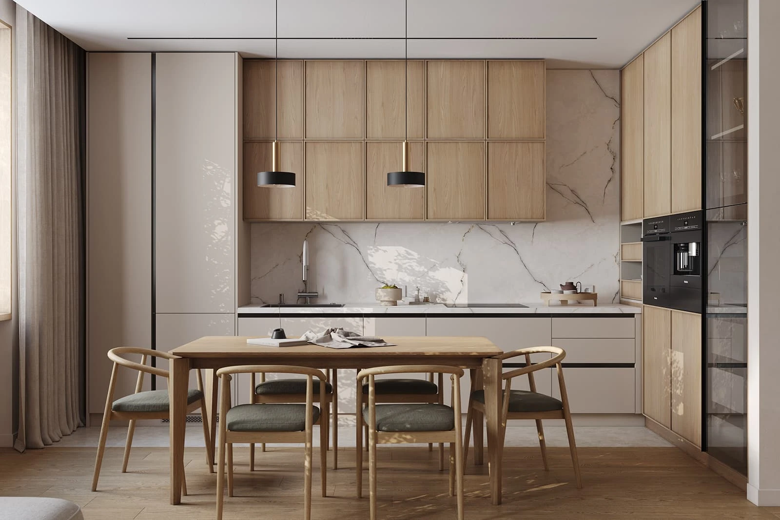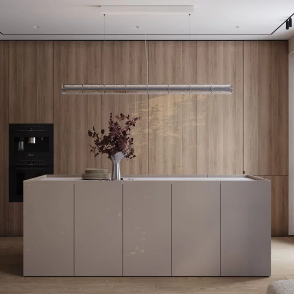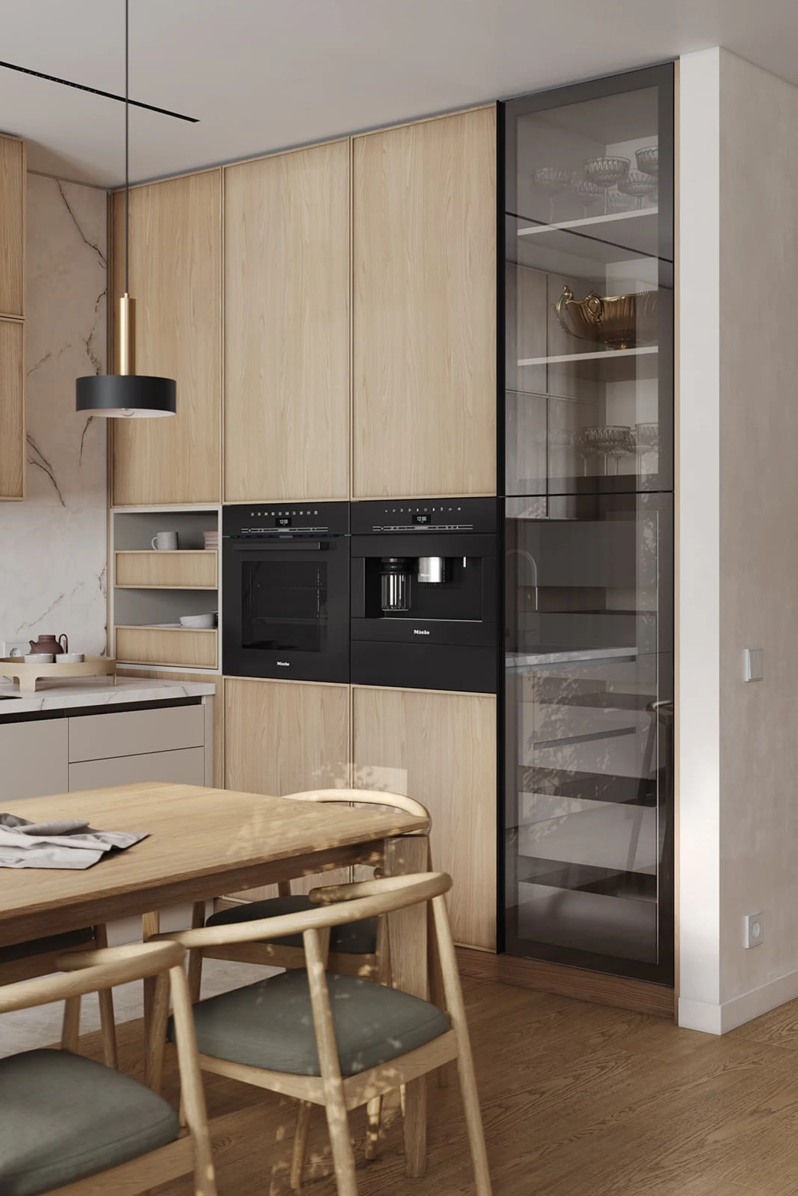 Кухня «НОЙС» воплощает современную элегантность с природными акцентами. Фасады объединяют ЛМДФ PRIME в цвете Шелковый со шпоном дуба с белым воскобейцем. Столешница из пластика HPL декора Миони создает практичную рабочую поверхность. Витрины с алюминиевым профилем А-3 Черный Браш и прозрачным стеклом добавляют изысканности.