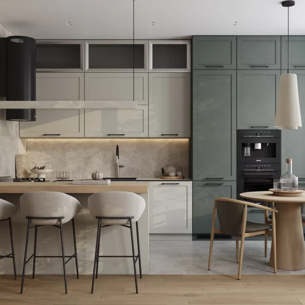 Кухня «НОРВУД ’25» сочетает современные материалы и природную текстуру дерева. Фасады Норвуд МДФ/PET в цвете Ангора объединены со шпоном дуба темного оттенка. Столешница из пластика HPL декора Мерида создает практичную рабочую поверхность. Витрины с прозрачным тисненым стеклом добавляют легкости интерьеру.