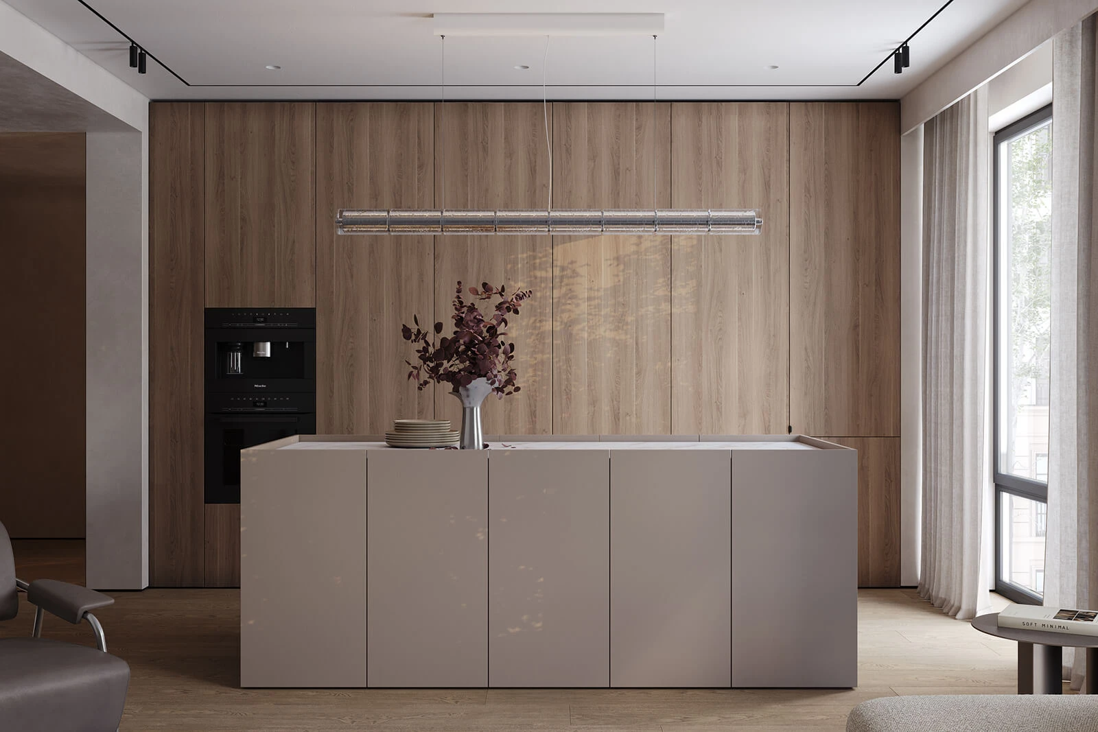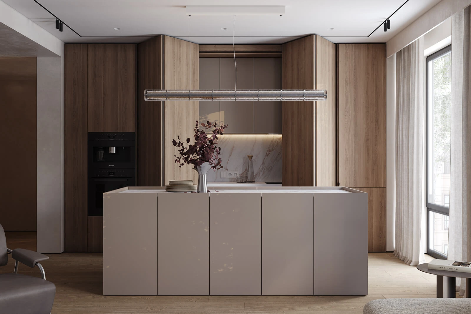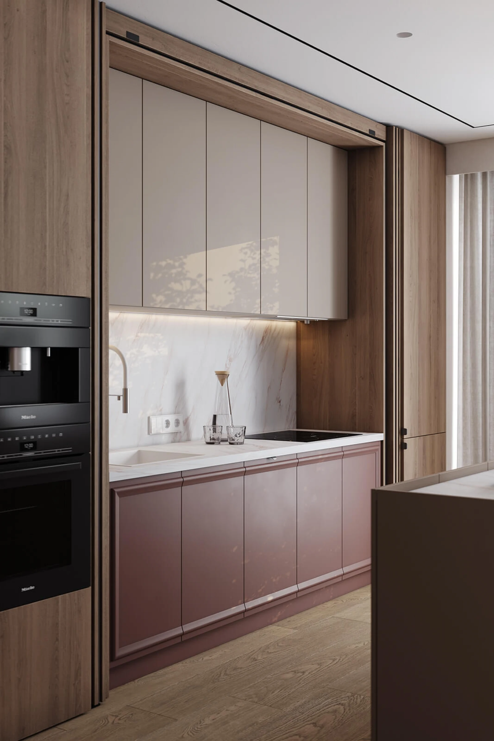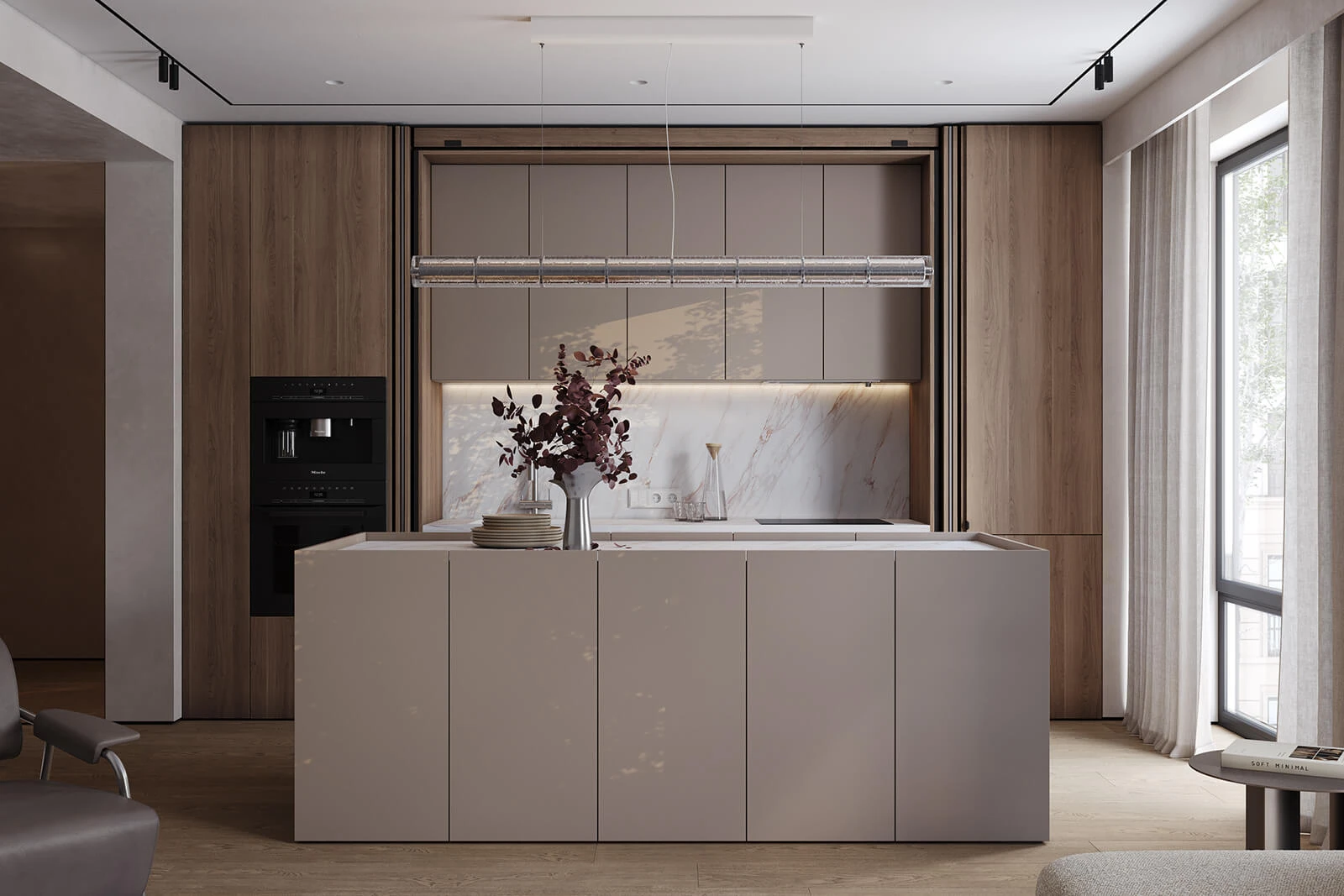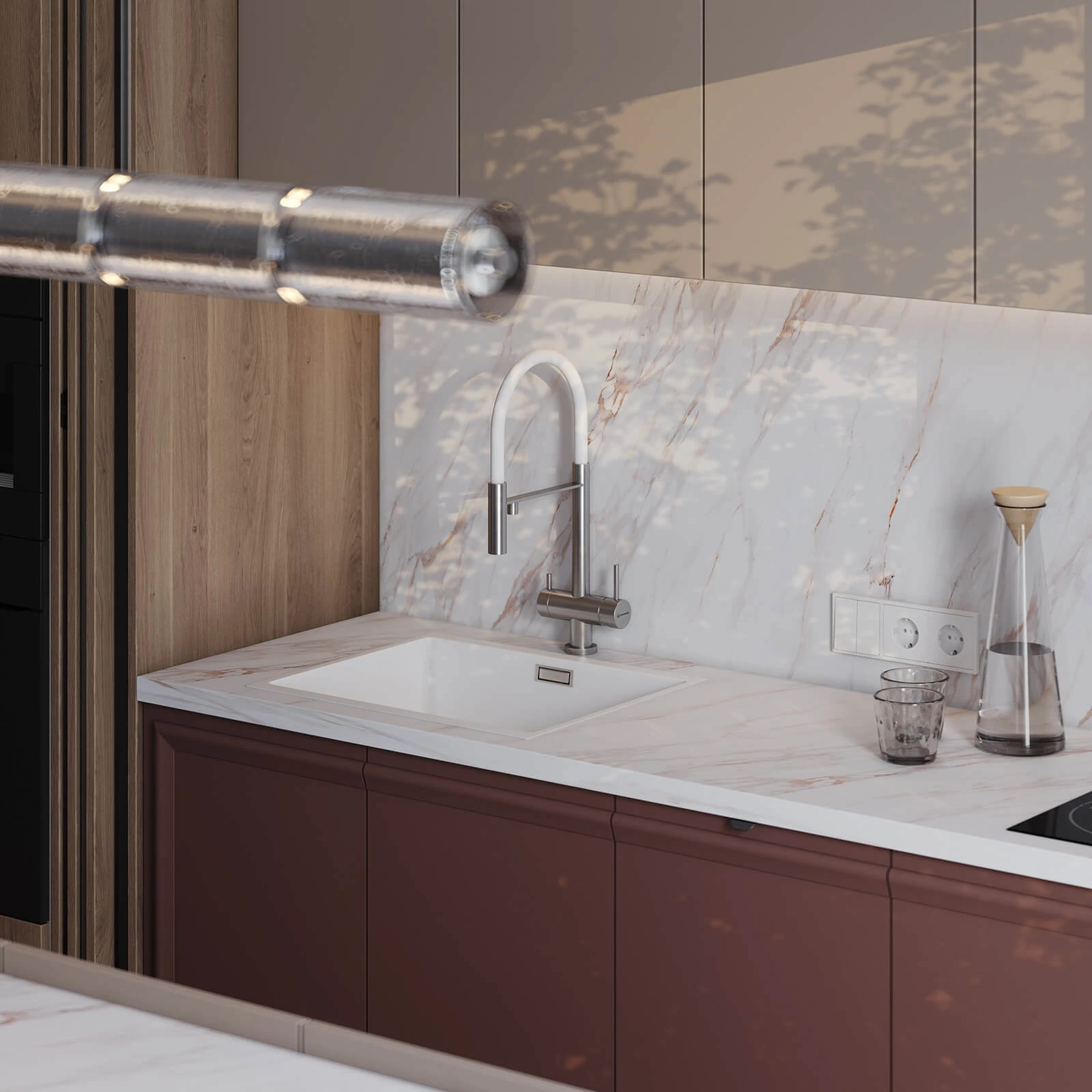 Современная кухня «САФАРИ» сочетает богатую палитру теплых оттенков и продуманную эргономику. Фасады объединяют ЛМДФ SUPRAMAT цвета Сафари, ЛМДФ Тимбер декора Кунео Коричневый и крашеную МДФ в матовом бордовом оттенке. Столешница из пластика HPL декора Энцо создает практичную рабочую поверхность. Минималистичные ручки подчеркивают современный стиль.