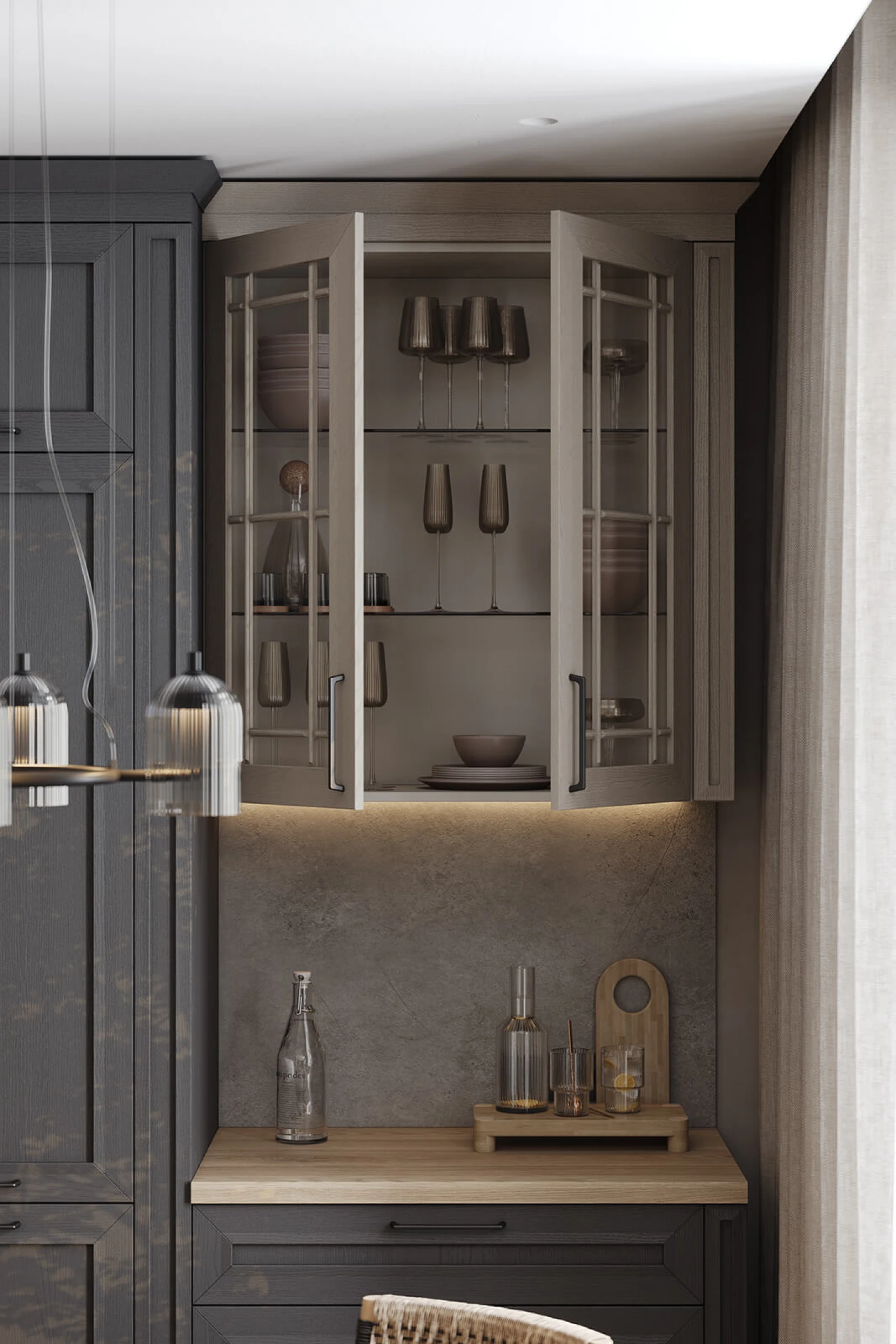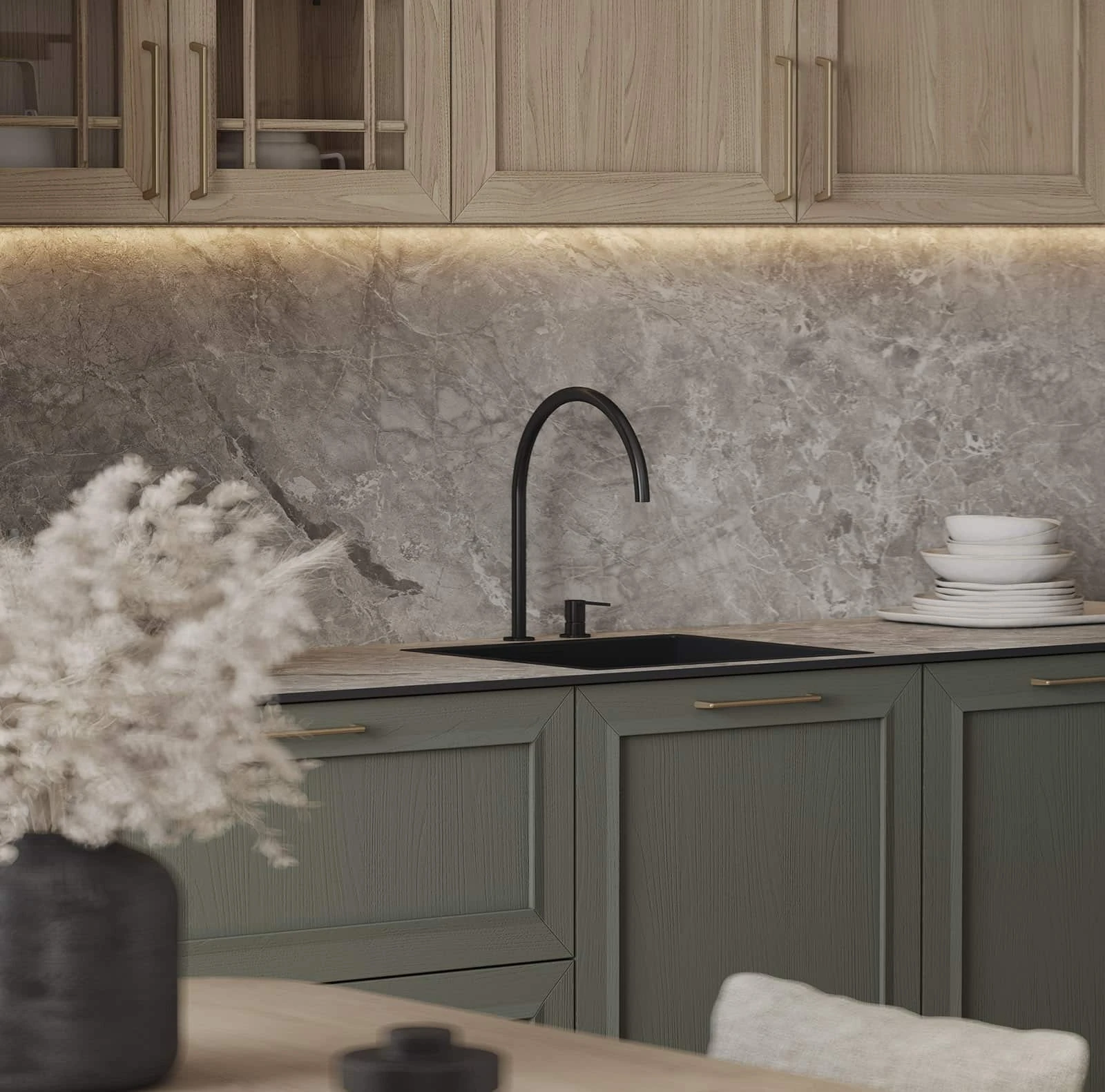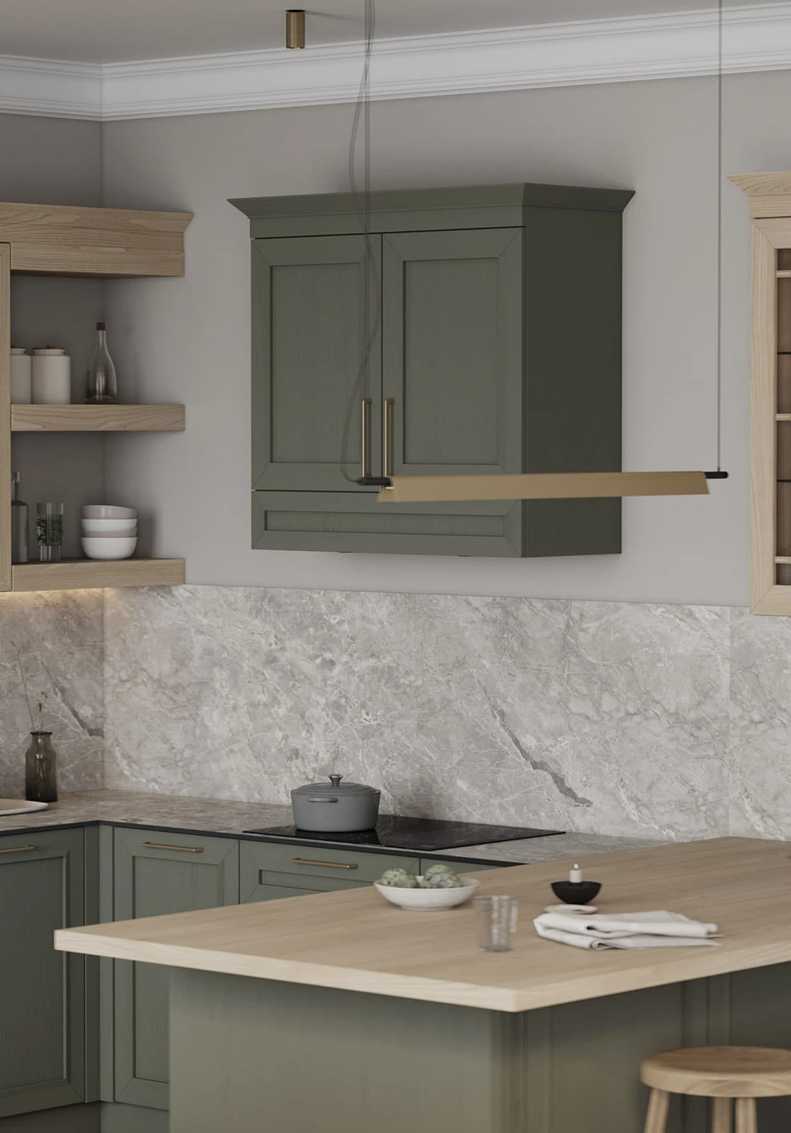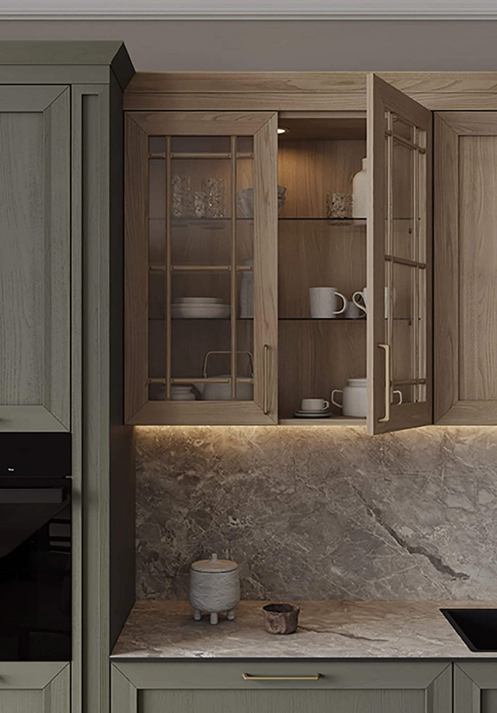 Кухня «ТОСКАНА» воплощает классическую элегантность с использованием натуральных материалов. Фасады из натурального дуба сочетают темно-зеленый оттенок и бесцветный масловоск. Столешницы объединяют компакт-плиту декора Римский Камень и массив дуба. Витрины с зеркальными вставками, ручки UZOCT-18 и выдвижные ящики из ольхи создают цельный образ. Декоративные элементы включают пилястры, багет, портал под вытяжку и настенную полку из МДФ со шпоном дуба.