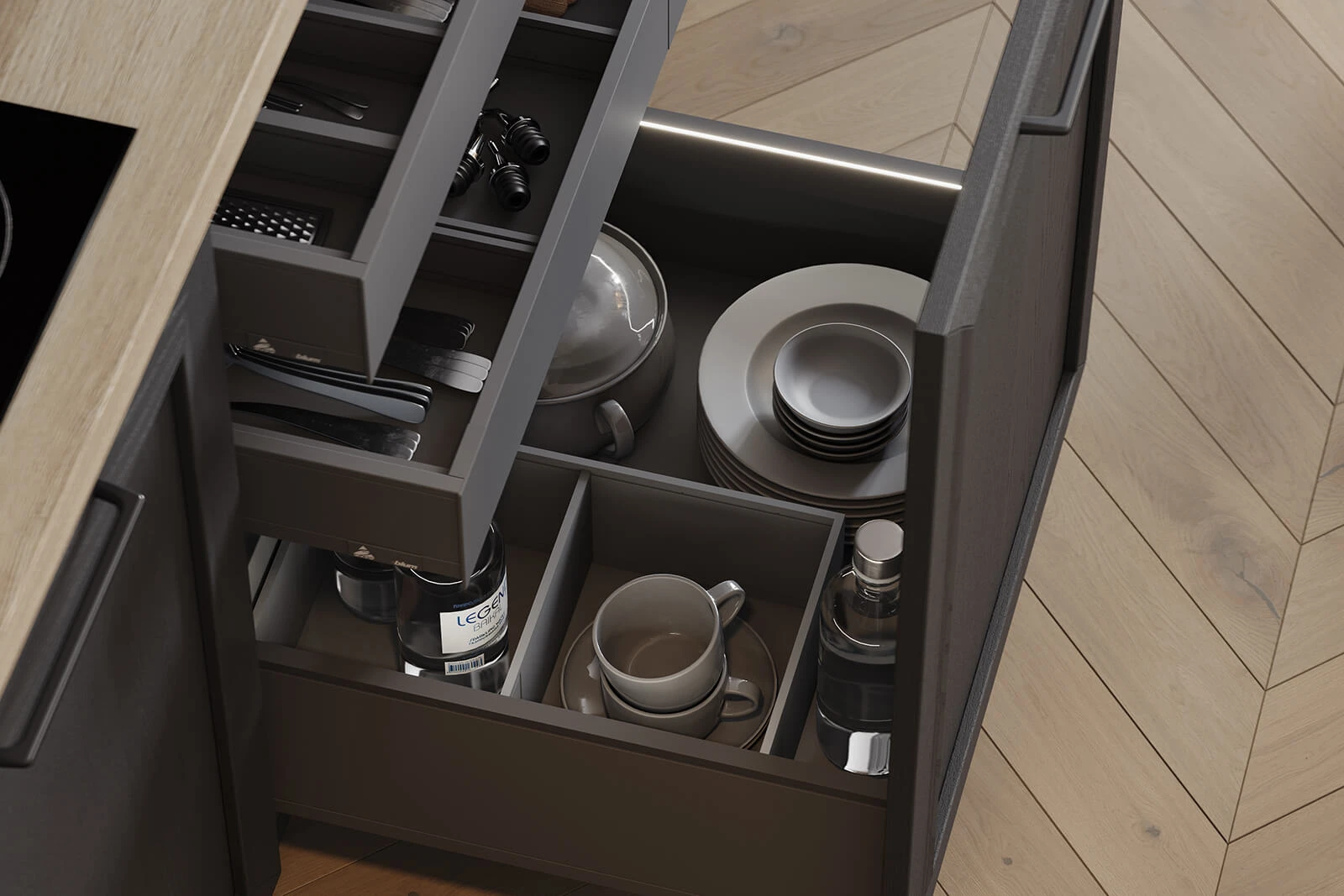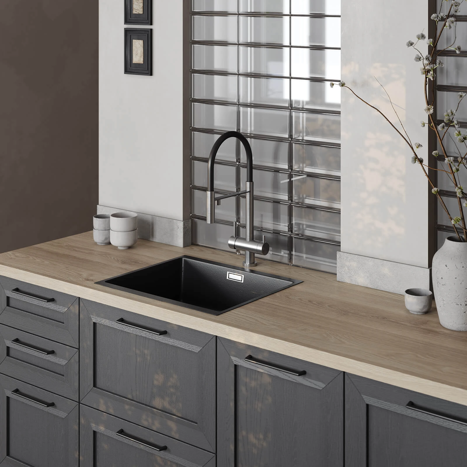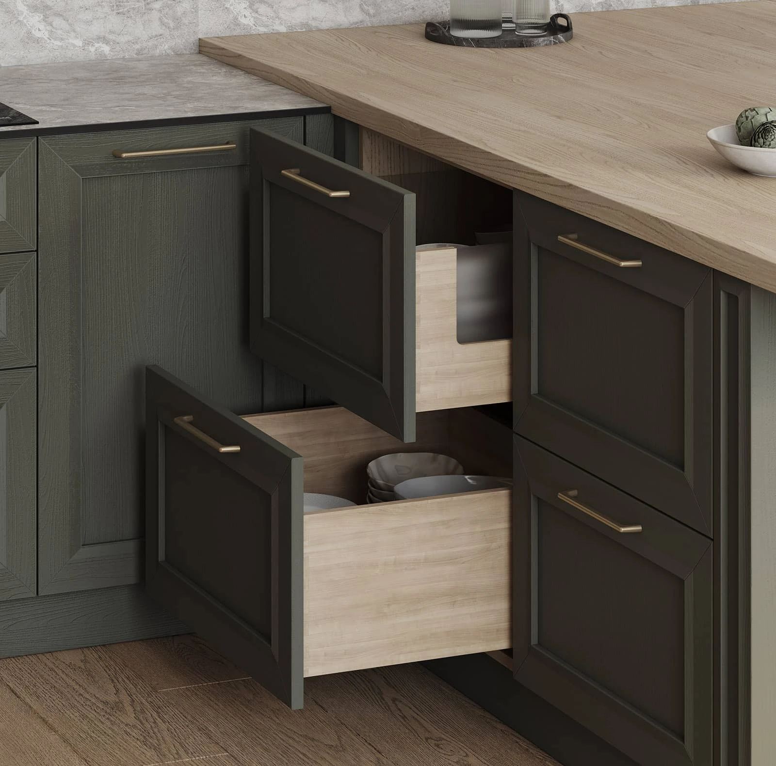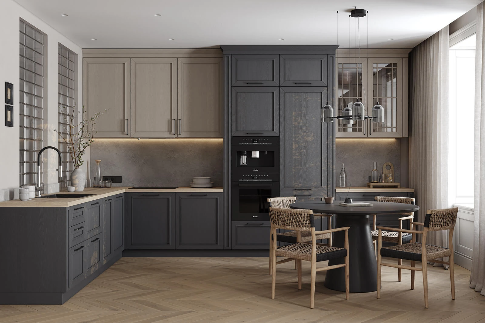 Кухня «ТОСКАНА» воплощает классическую элегантность с использованием натуральных материалов. Фасады из натурального дуба сочетают темно-зеленый оттенок и бесцветный масловоск. Столешницы объединяют компакт-плиту декора Римский Камень и массив дуба. Витрины с зеркальными вставками, ручки UZOCT-18 и выдвижные ящики из ольхи создают цельный образ. Декоративные элементы включают пилястры, багет, портал под вытяжку и настенную полку из МДФ со шпоном дуба.